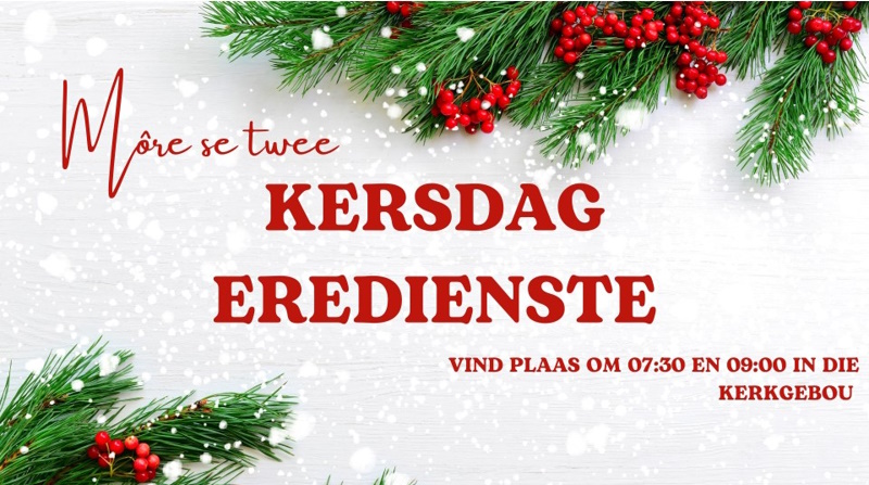 Ons gaan Kersdag afskop op ‘n gepaste manier – deur die Here te loof en te prys vir die geboorte van Jesus! Kom wees deel van een van die eredienste en bring sommer die hele familie saam om ook hierdie spesiale dag in ons geloof te vier!