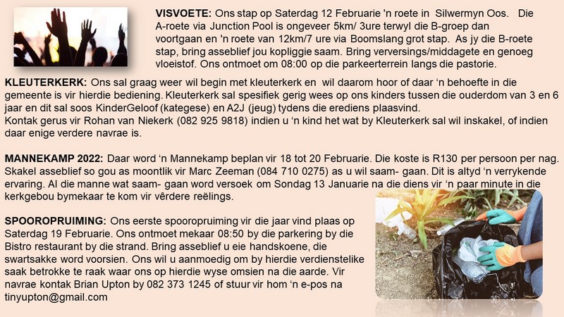 Om ons weeklikse nuusbrief te ontvang: Stuur ‘n e-pos na media@ngvishoek.co.za