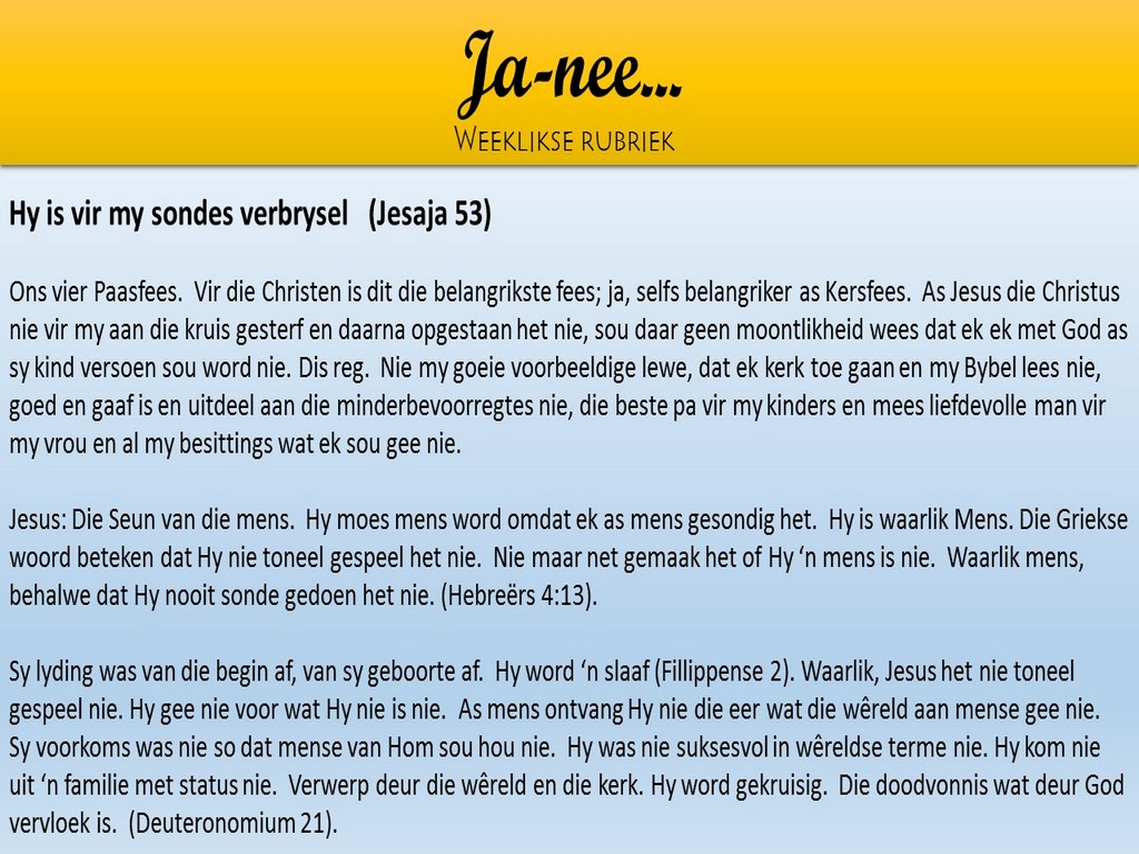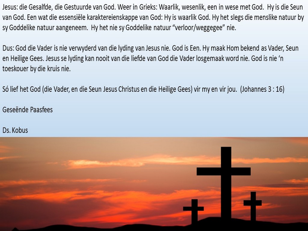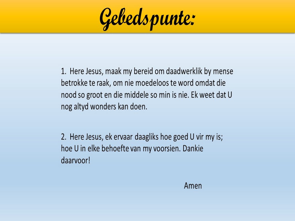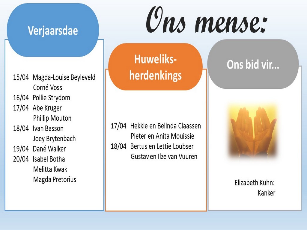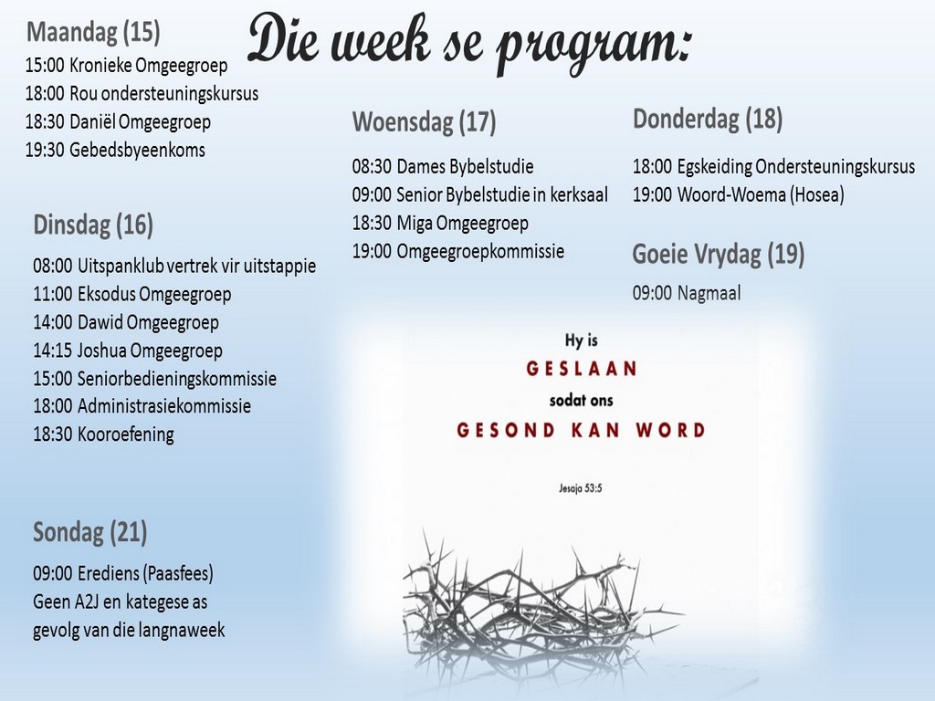 Om ons weeklikse nuusbrief te ontvang: Stuur 'n e-pos namedia@ngvishoek.co.za