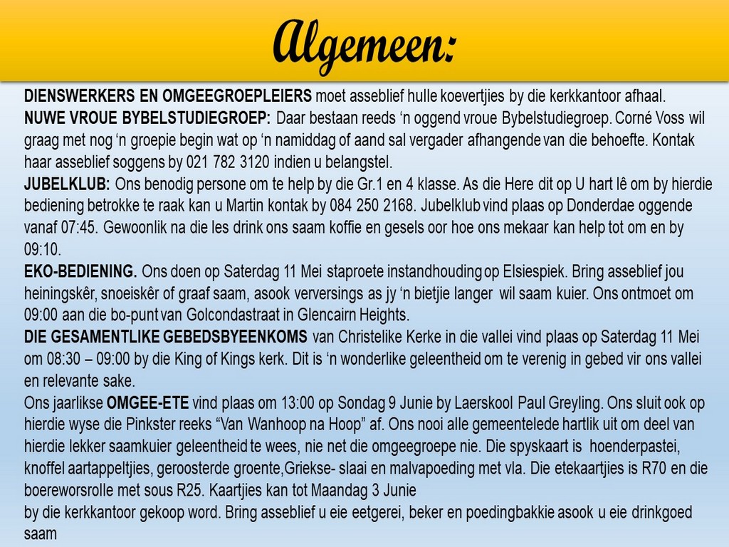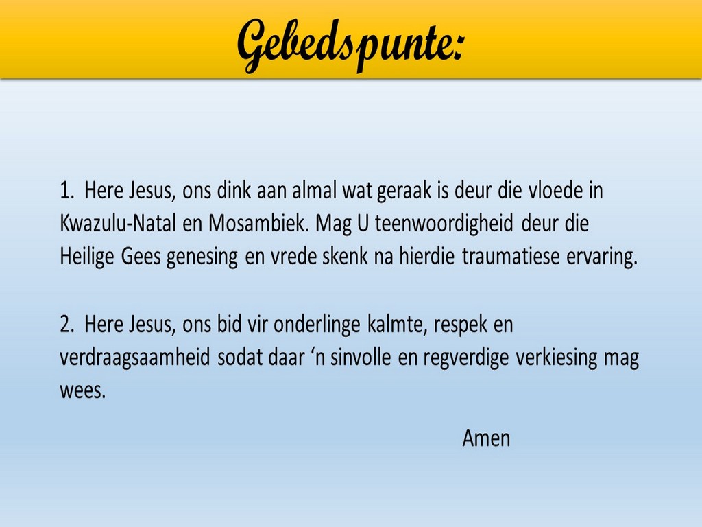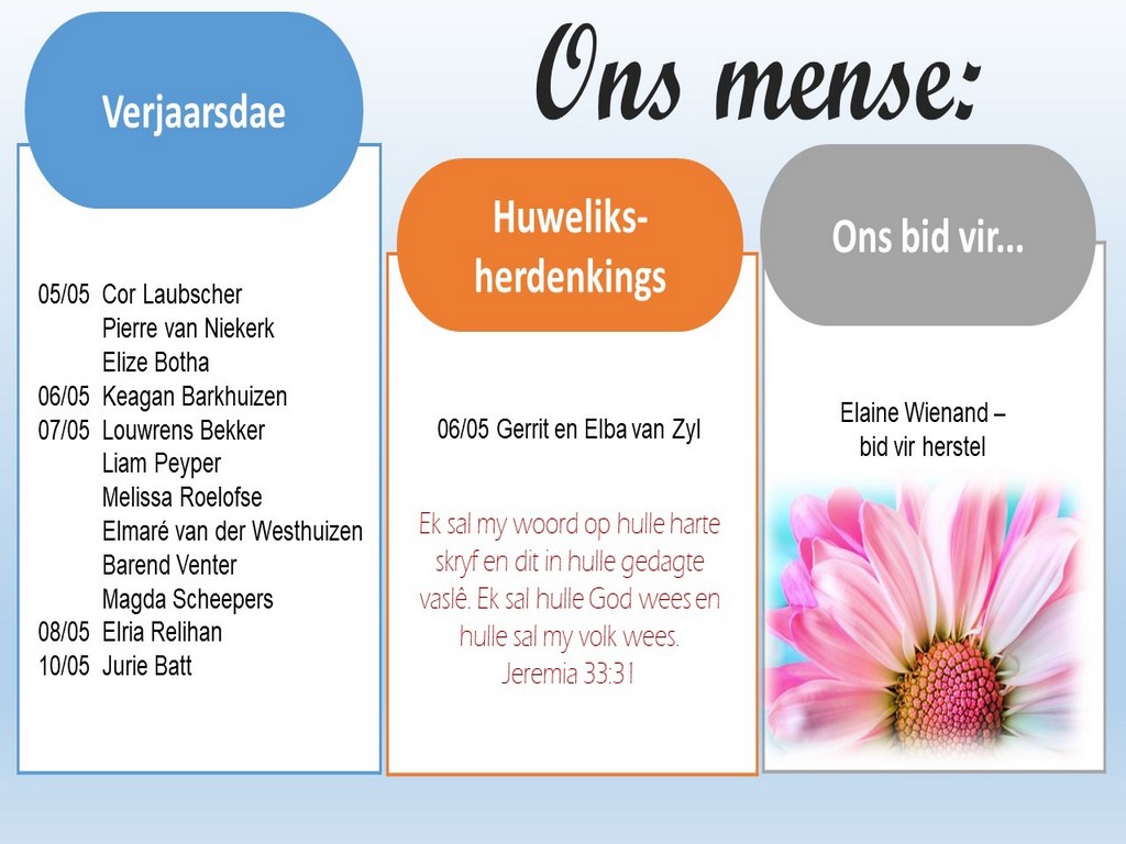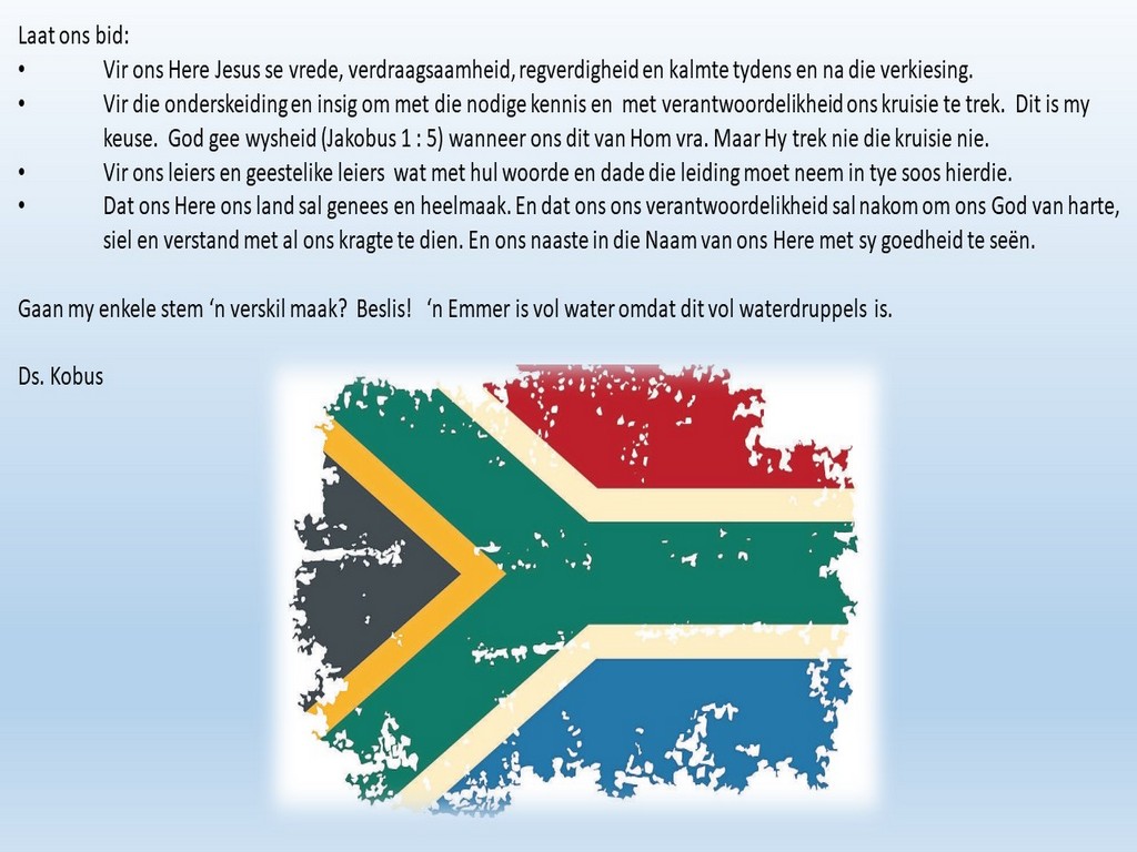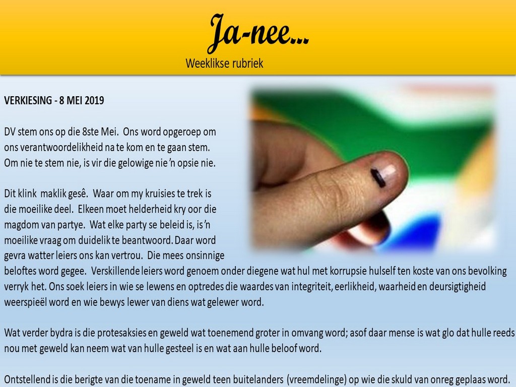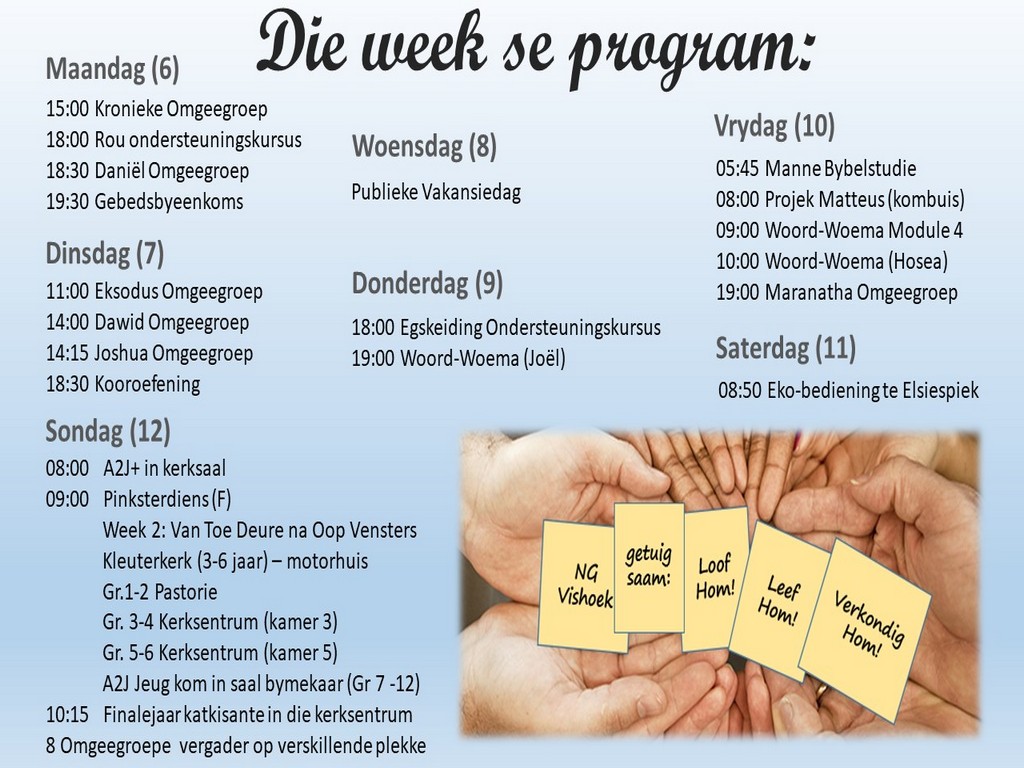 Om ons weeklikse nuusbrief te ontvang: Stuur 'n e-pos namedia@ngvishoek.co.za