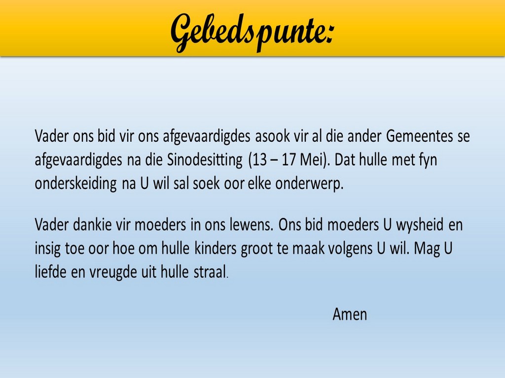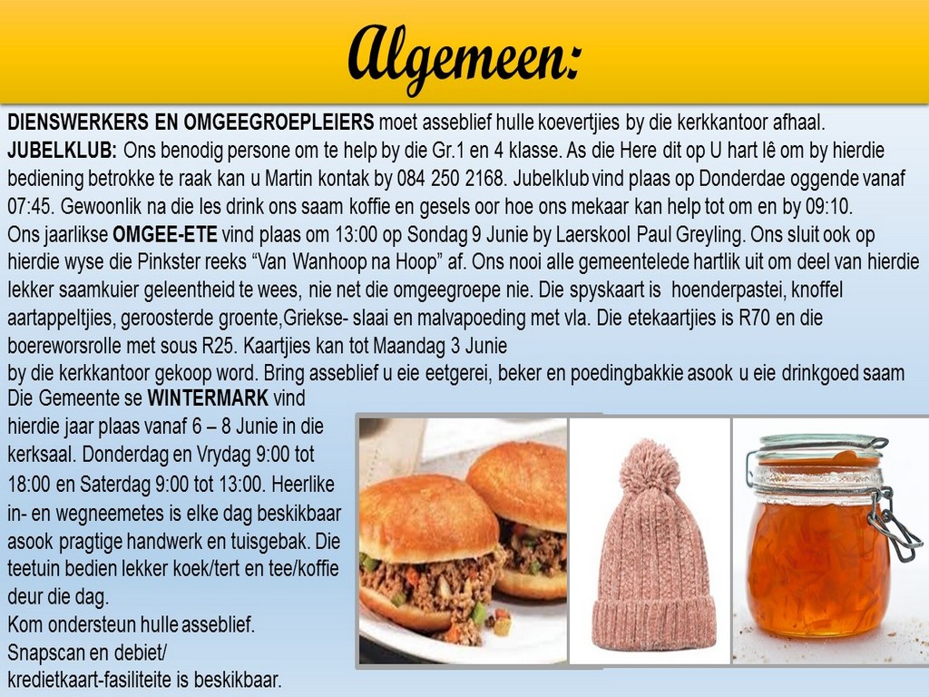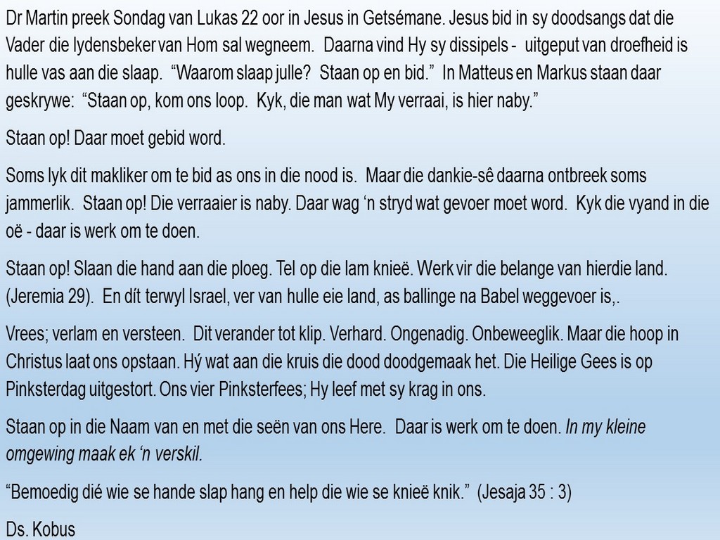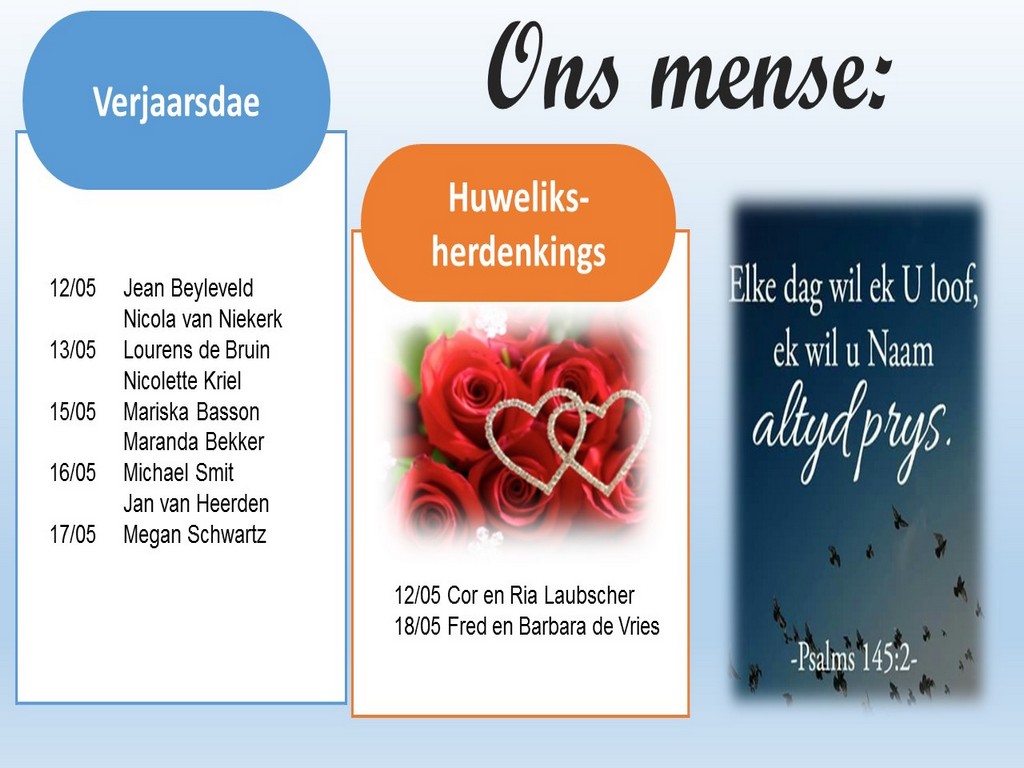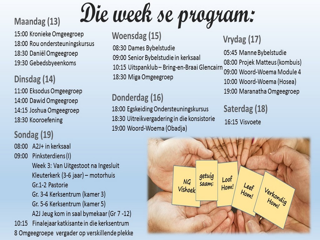 Om ons weeklikse nuusbrief te ontvang: Stuur 'n e-pos namedia@ngvishoek.co.za