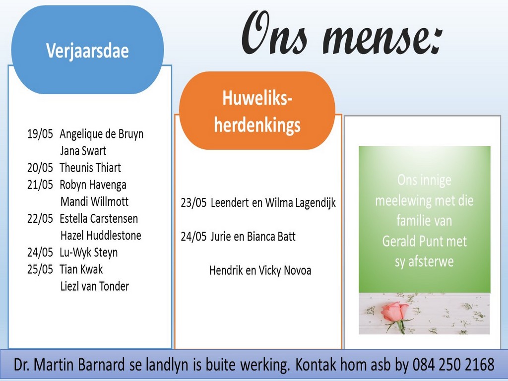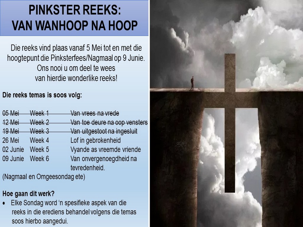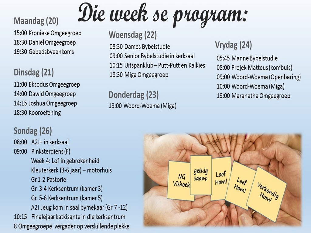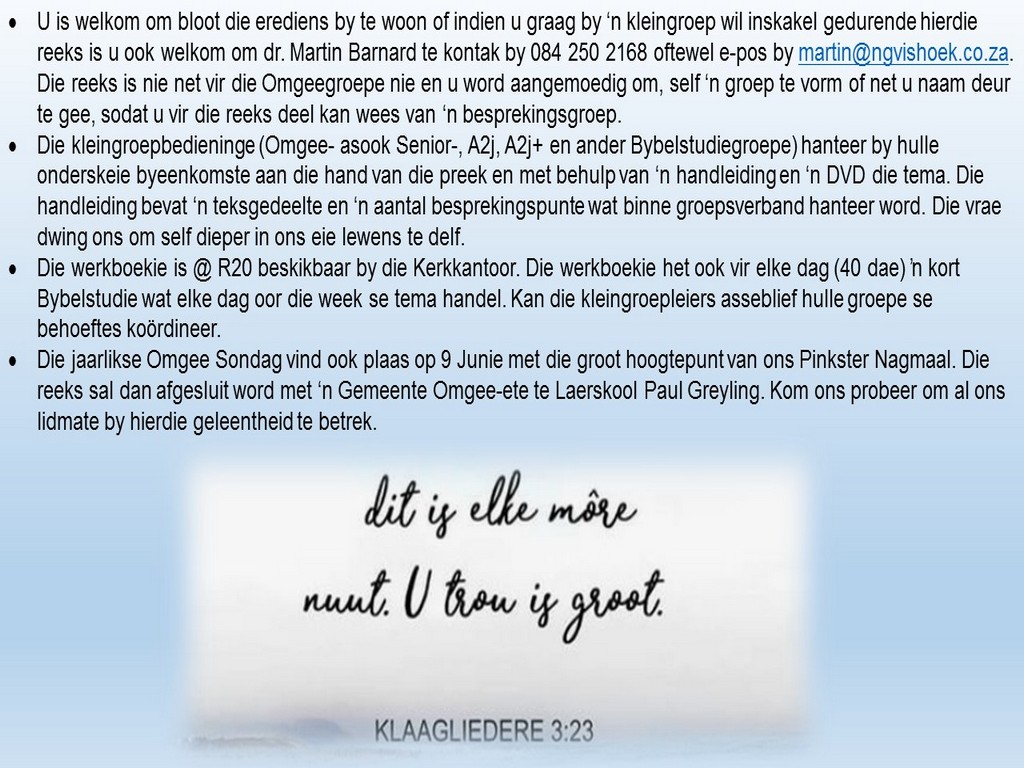 Om ons weeklikse nuusbrief te ontvang: Stuur 'n e-pos namedia@ngvishoek.co.za