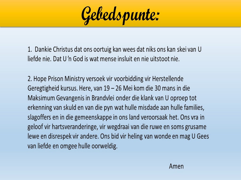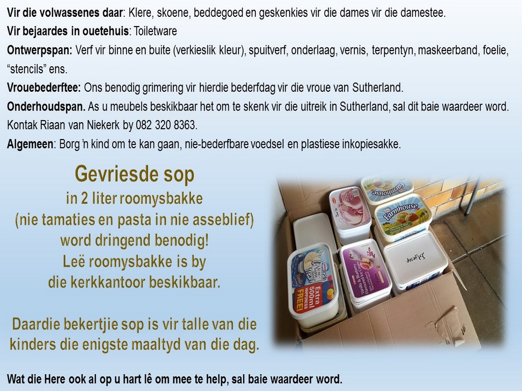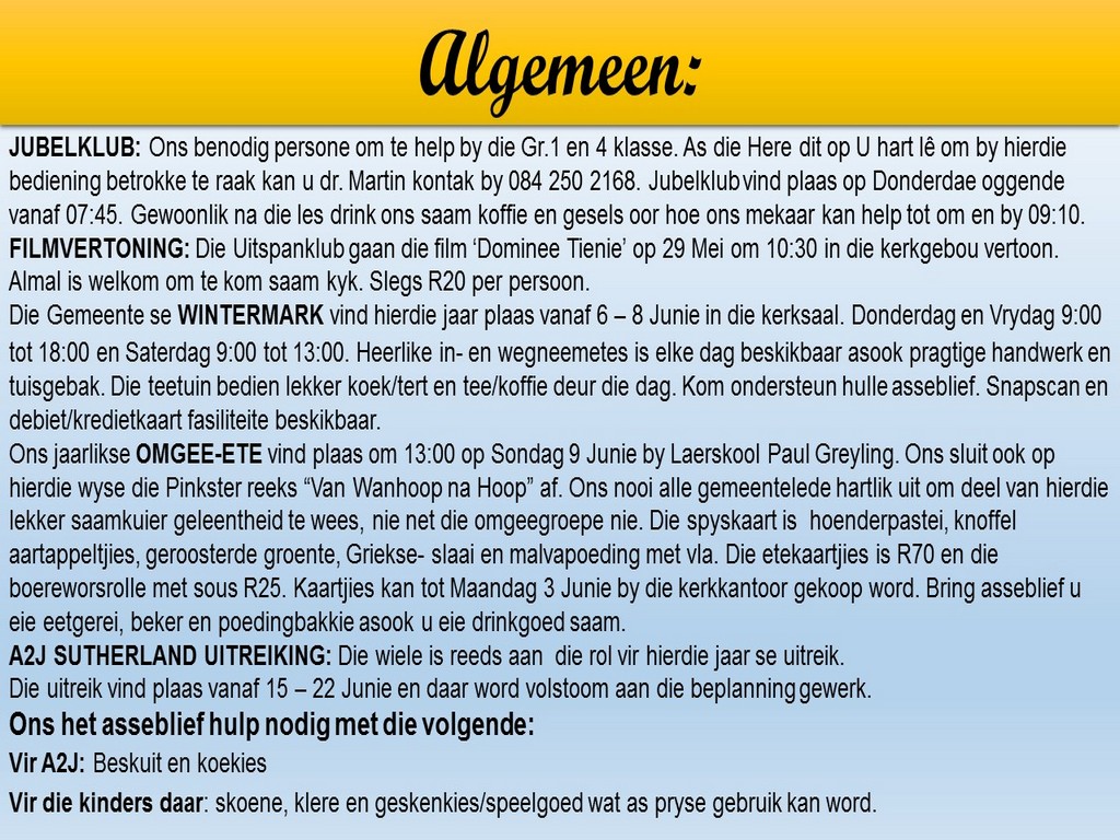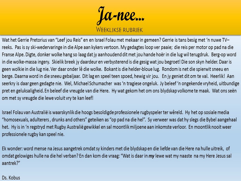 Om ons weeklikse nuusbrief te ontvang: Stuur 'n e-pos namedia@ngvishoek.co.za