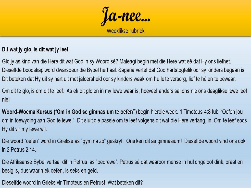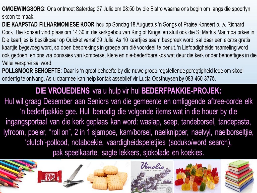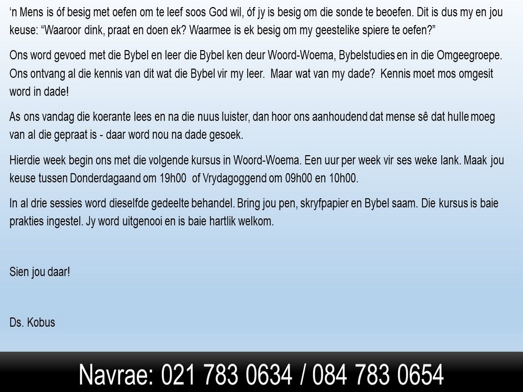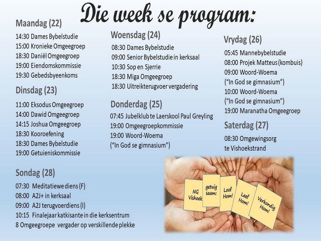 Om ons weeklikse nuusbrief te ontvang: Stuur 'n e-pos namedia@ngvishoek.co.za