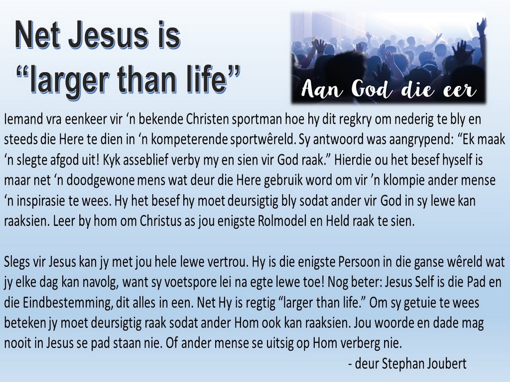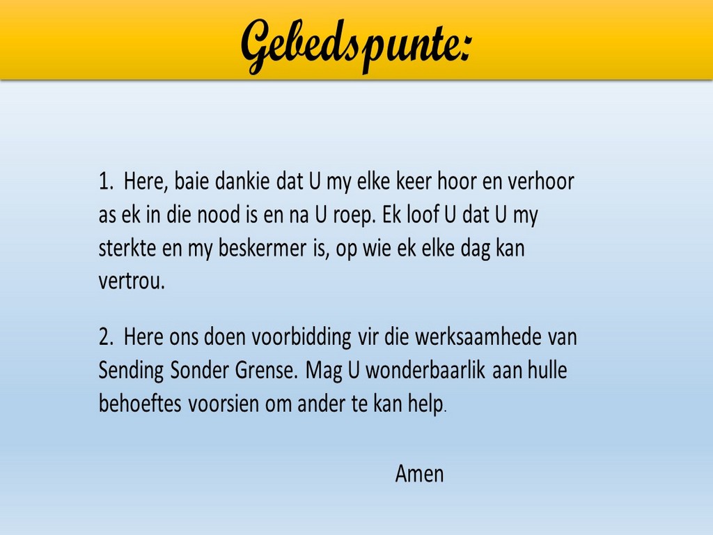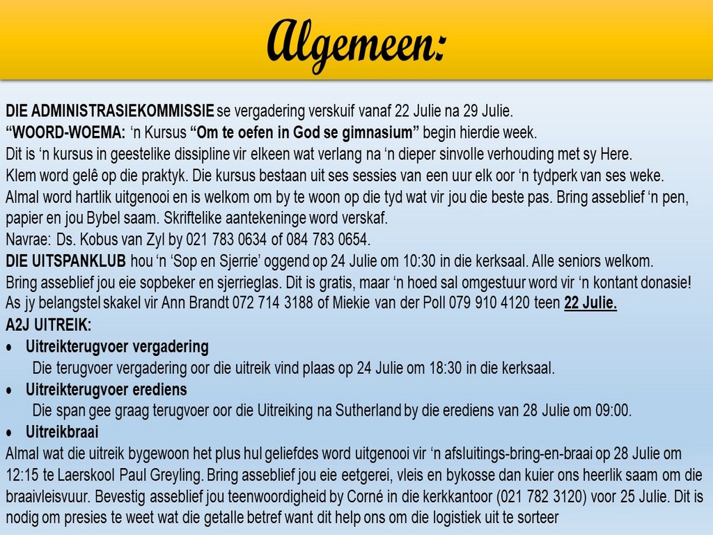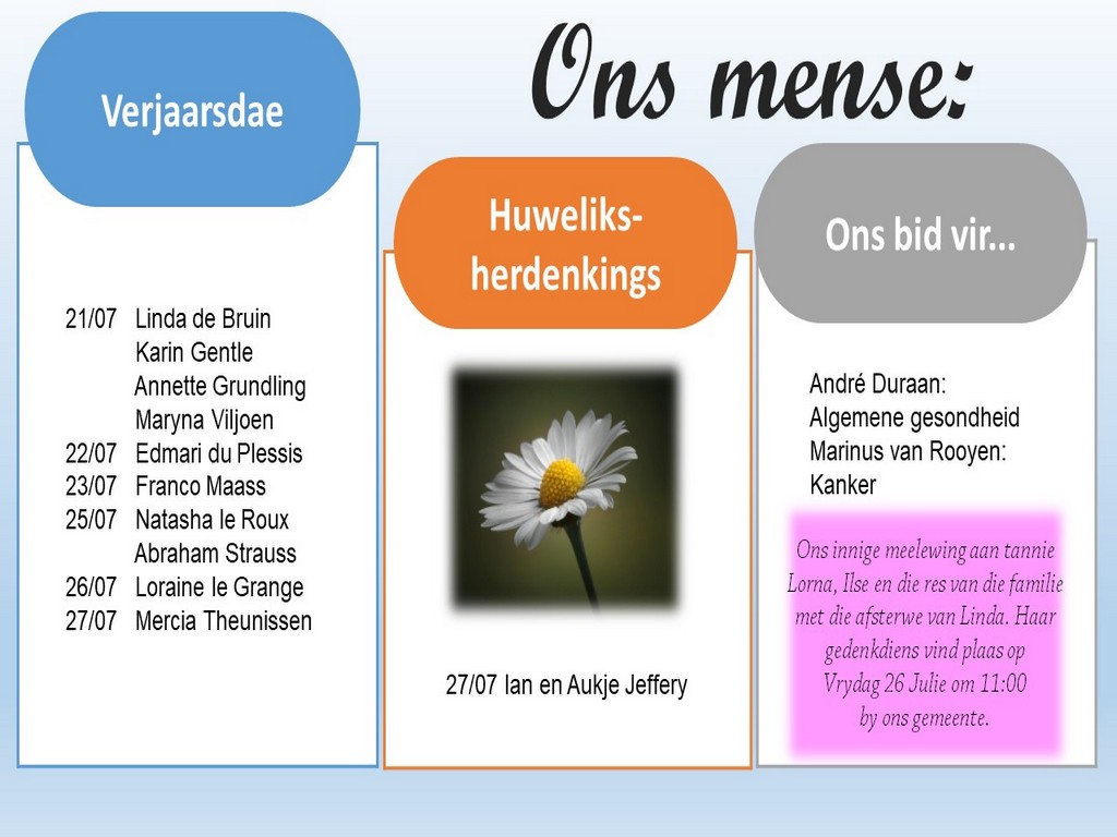 Om ons weeklikse nuusbrief te ontvang: Stuur 'n e-pos namedia@ngvishoek.co.za