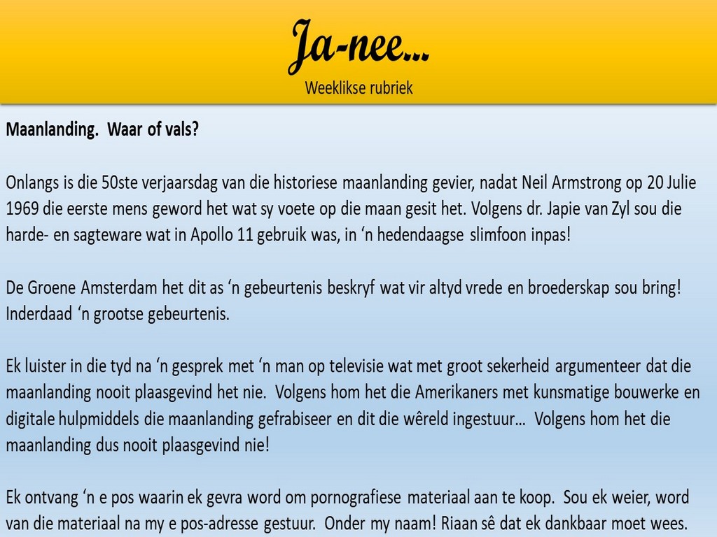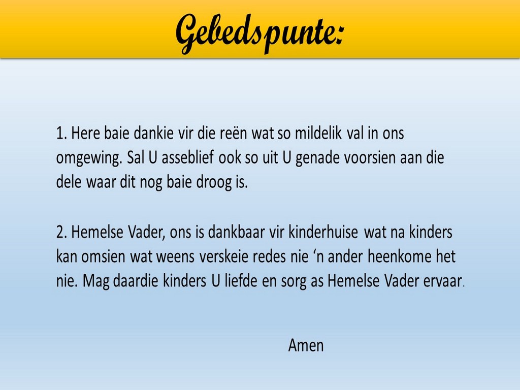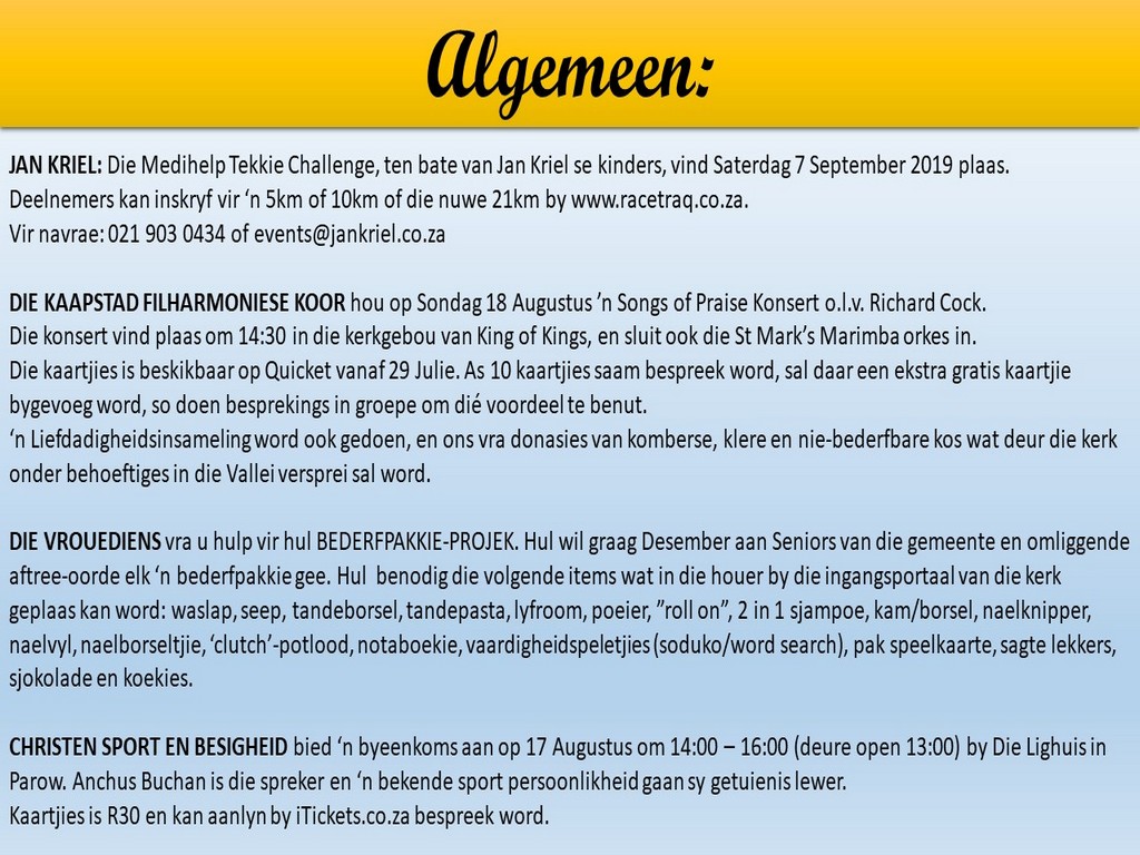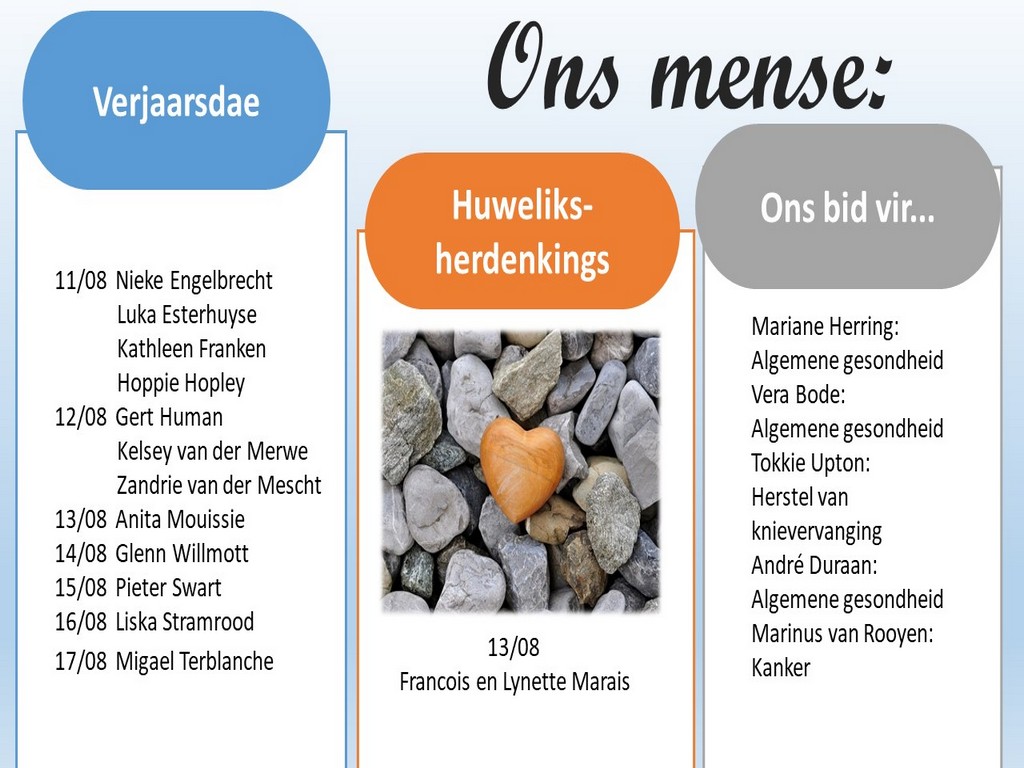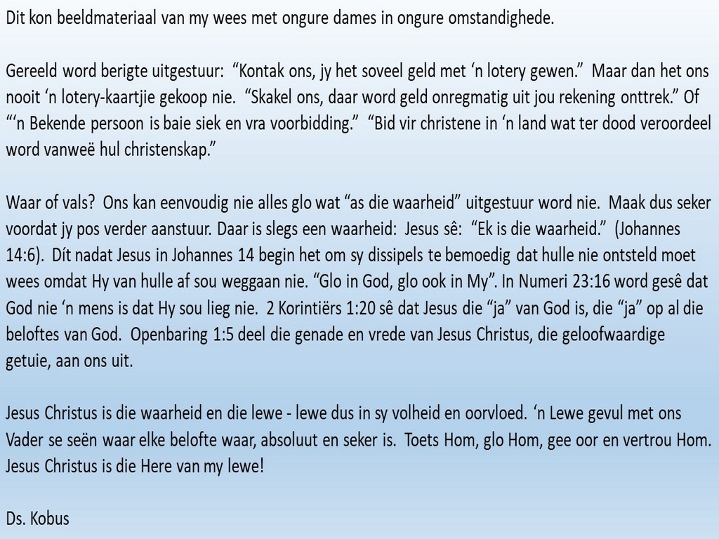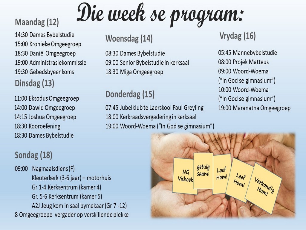 Om ons weeklikse nuusbrief te ontvang: Stuur 'n e-pos namedia@ngvishoek.co.za