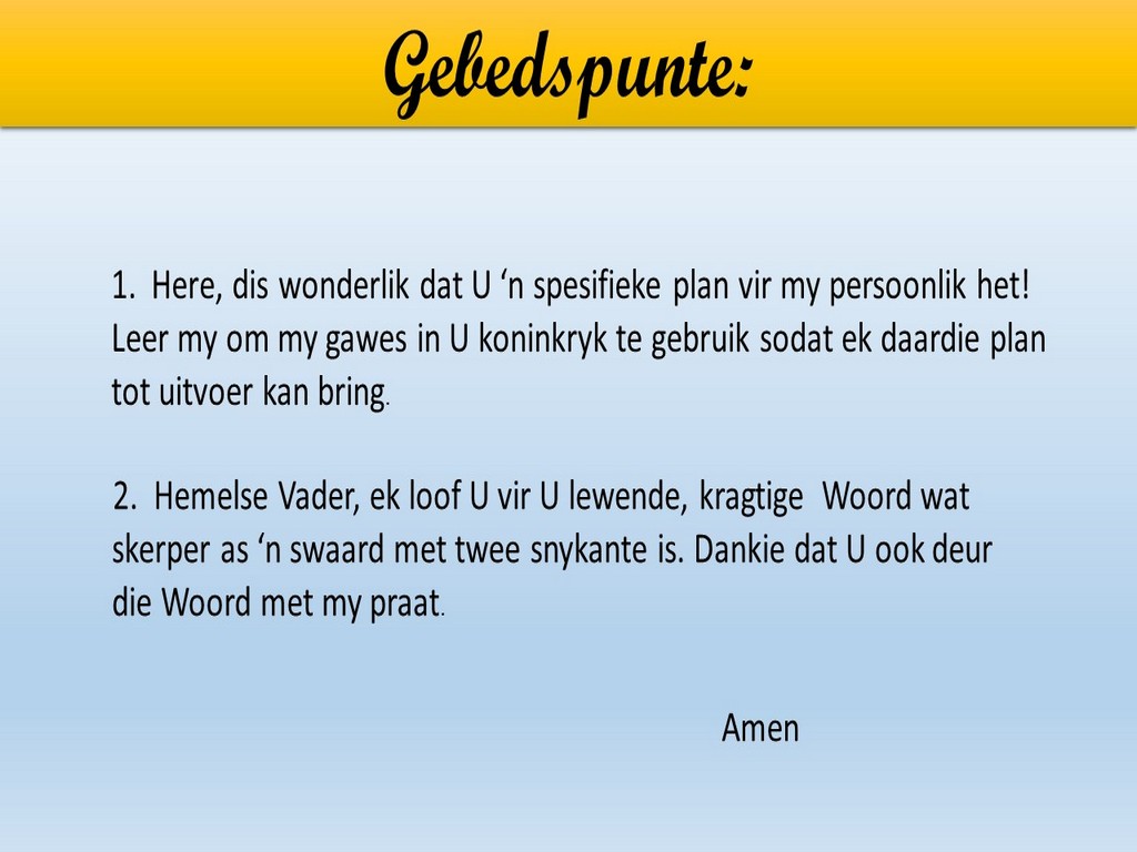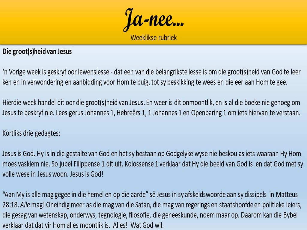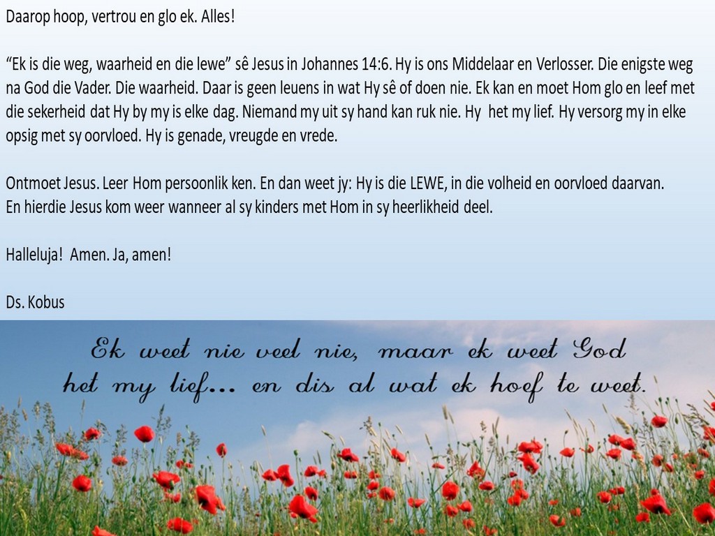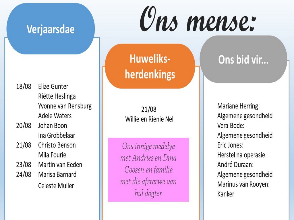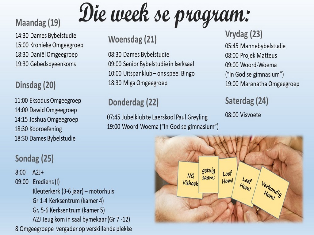 Om ons weeklikse nuusbrief te ontvang: Stuur 'n e-pos namedia@ngvishoek.co.za