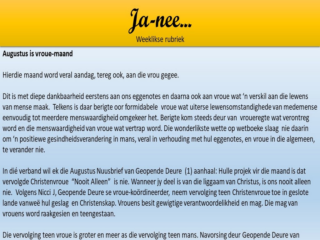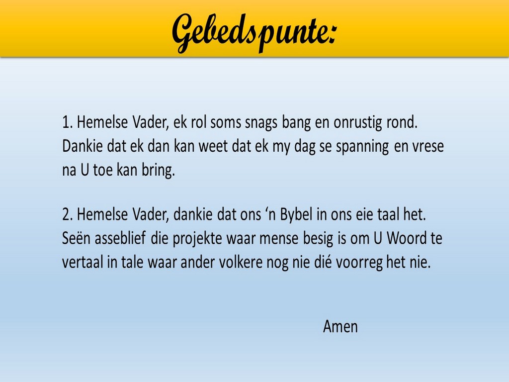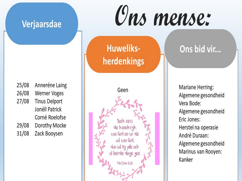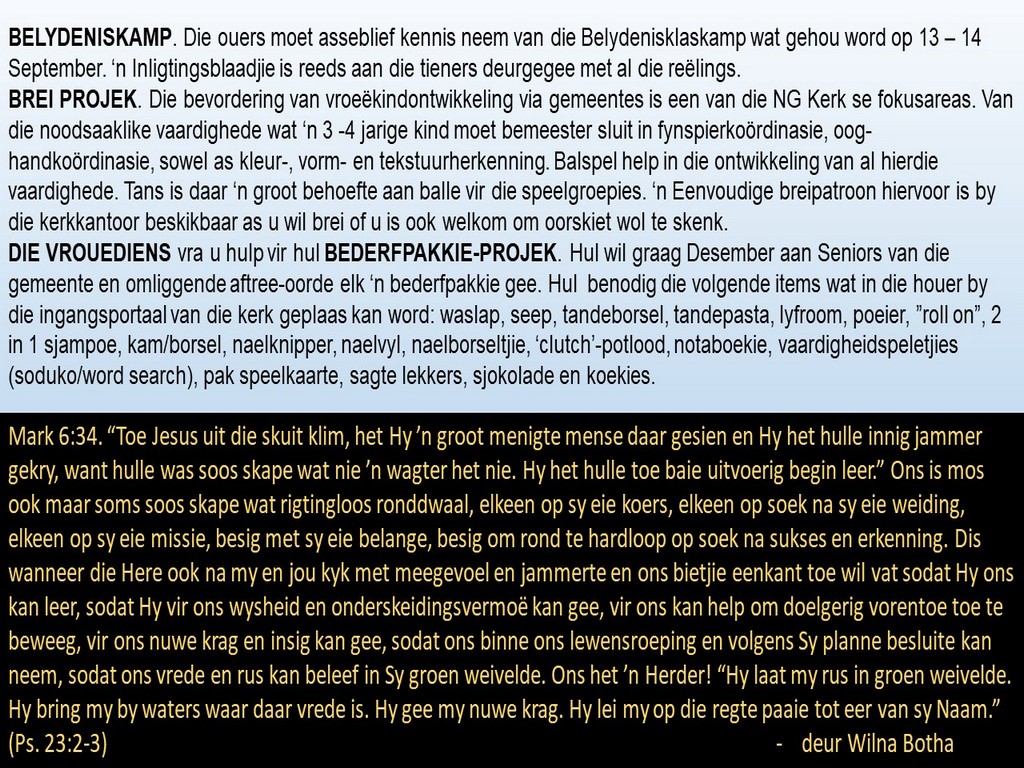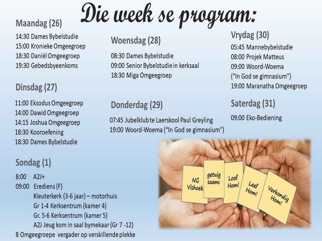 Om ons weeklikse nuusbrief te ontvang: Stuur 'n e-pos namedia@ngvishoek.co.za