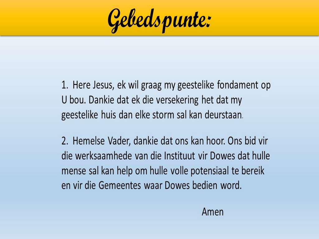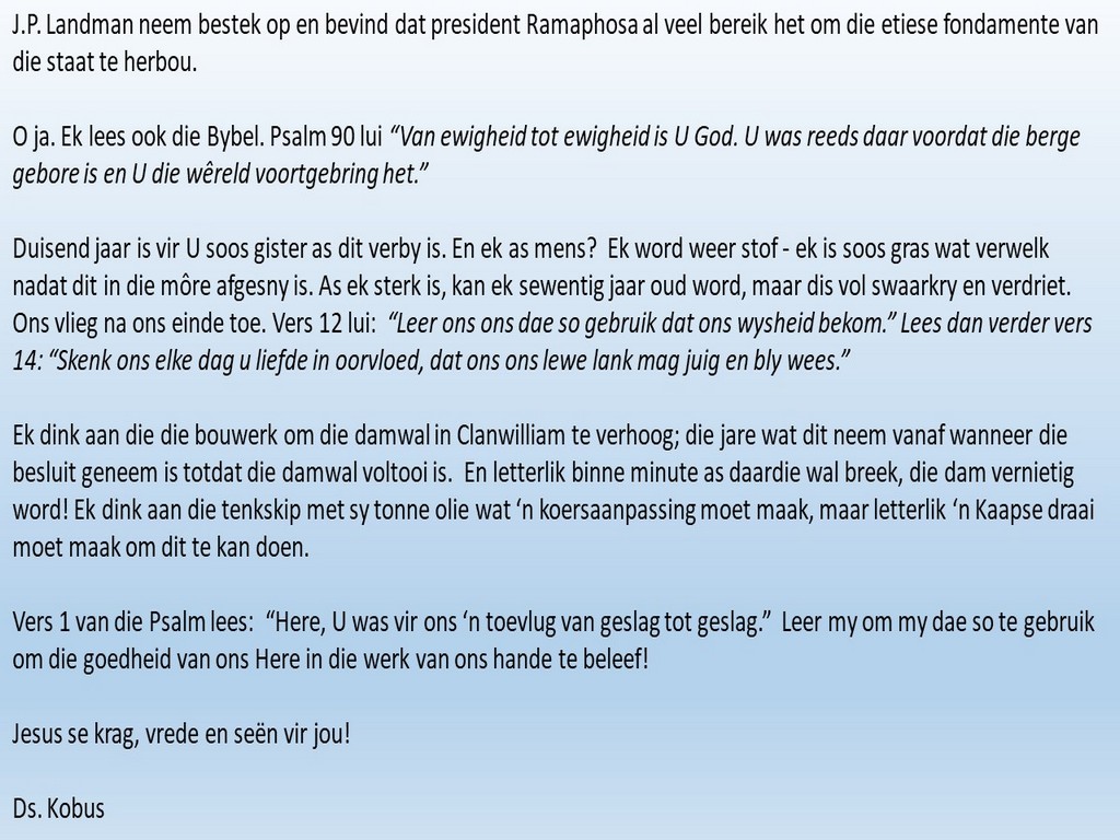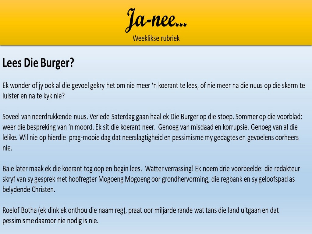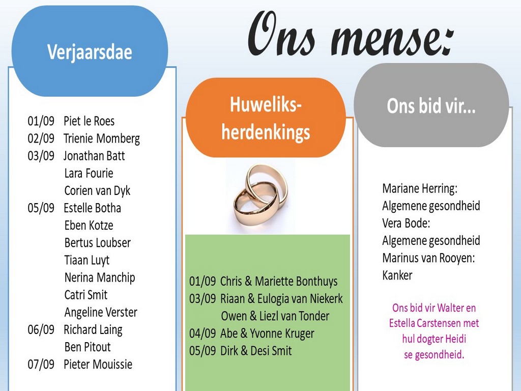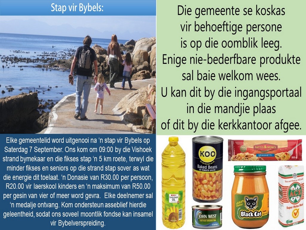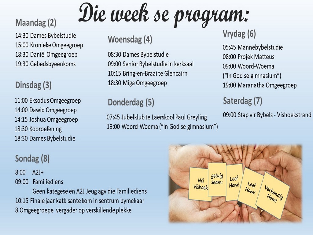 Om ons weeklikse nuusbrief te ontvang: Stuur 'n e-pos namedia@ngvishoek.co.za