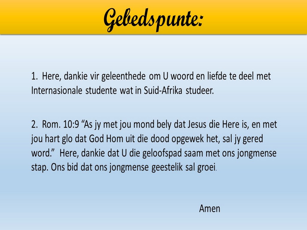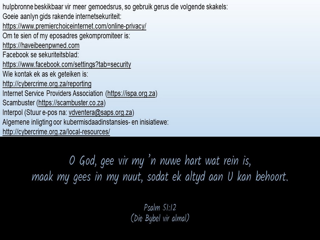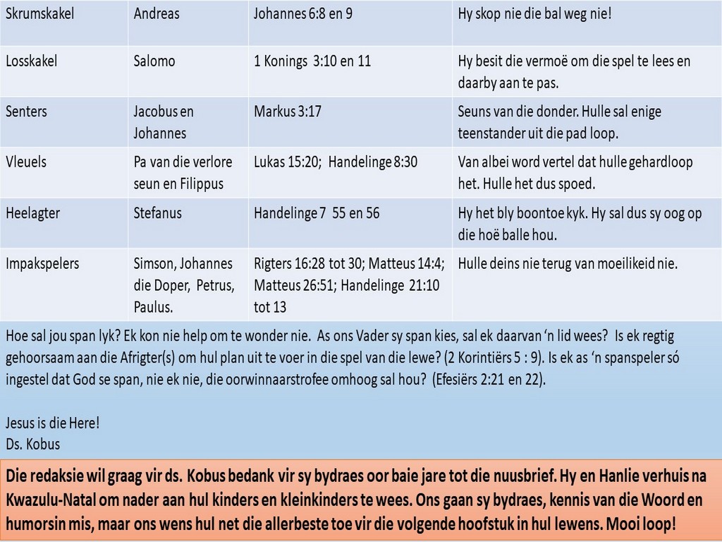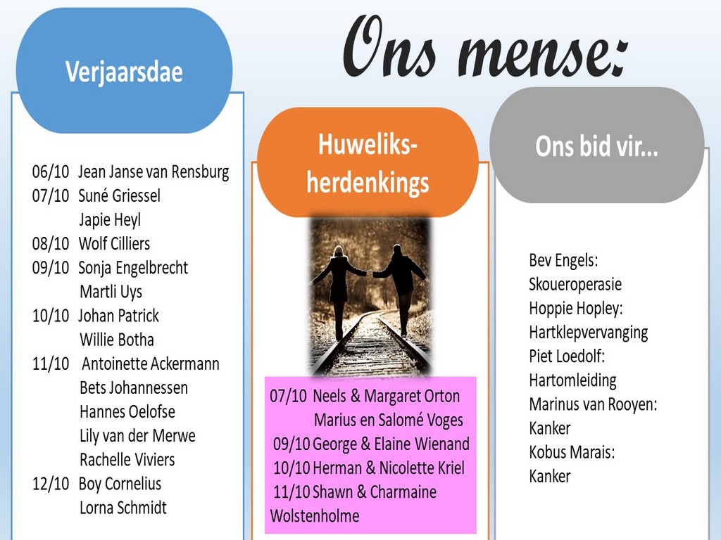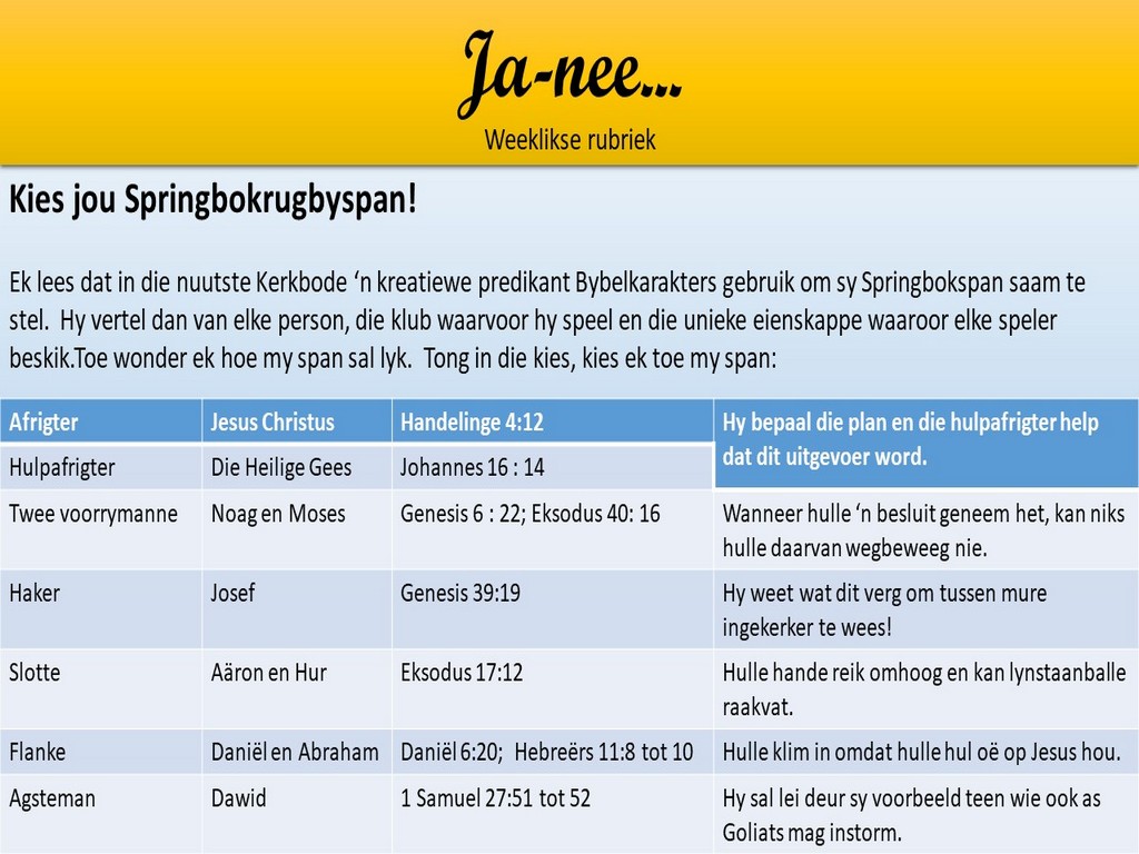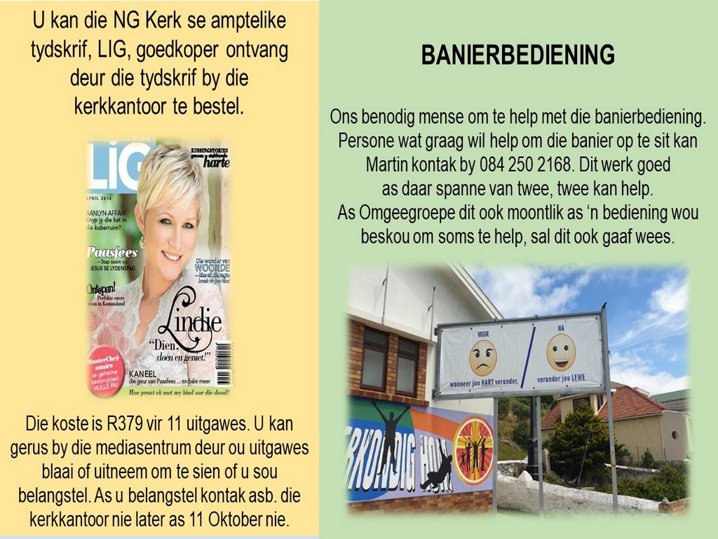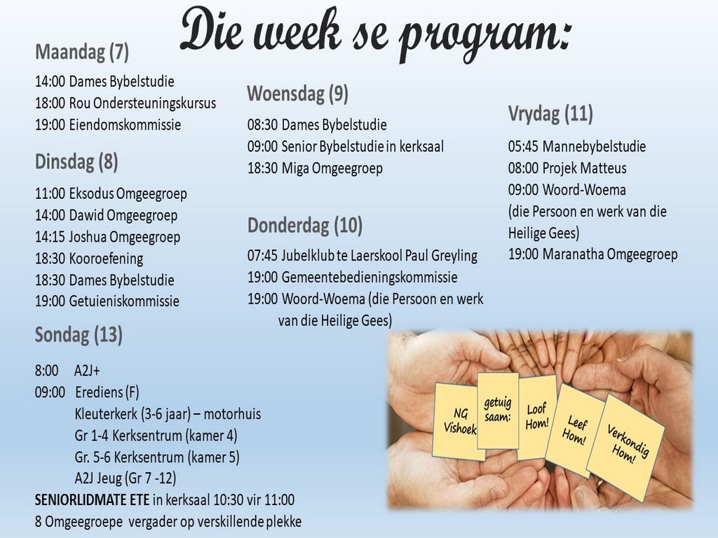 Om ons weeklikse nuusbrief te ontvang: Stuur 'n e-pos namedia@ngvishoek.co.za