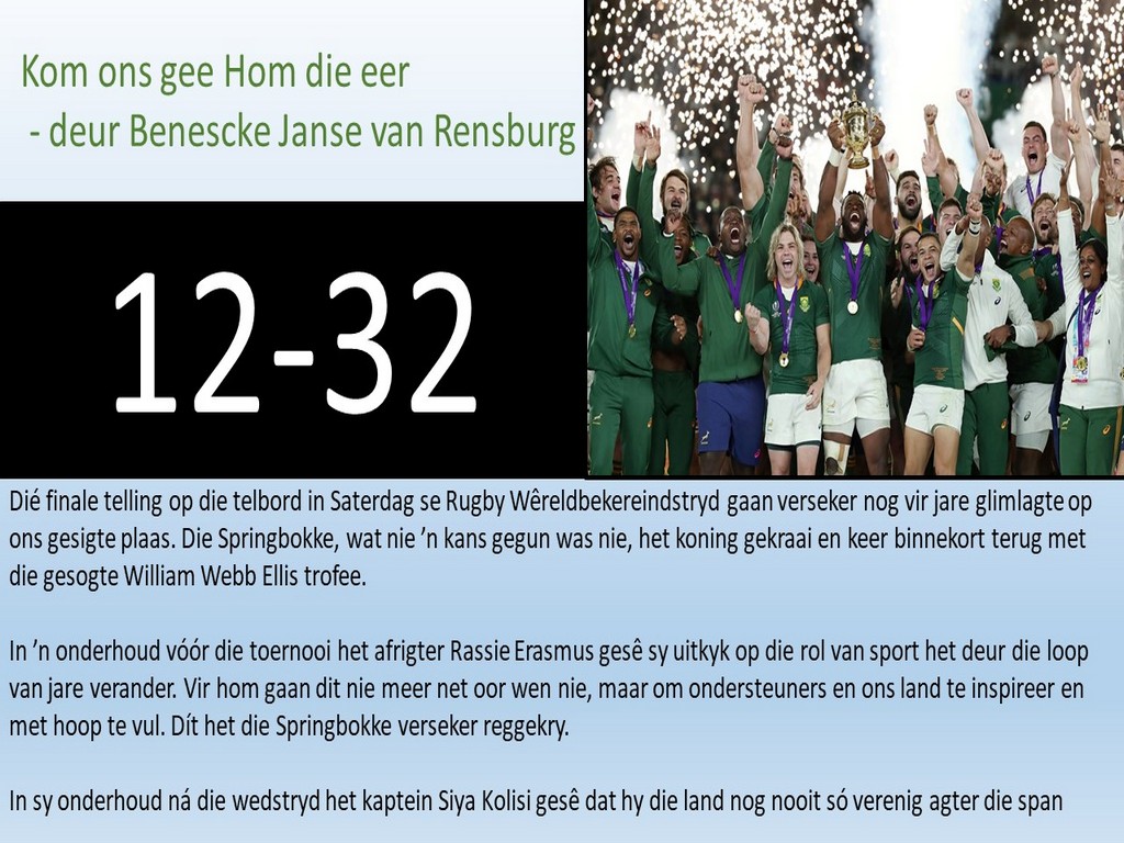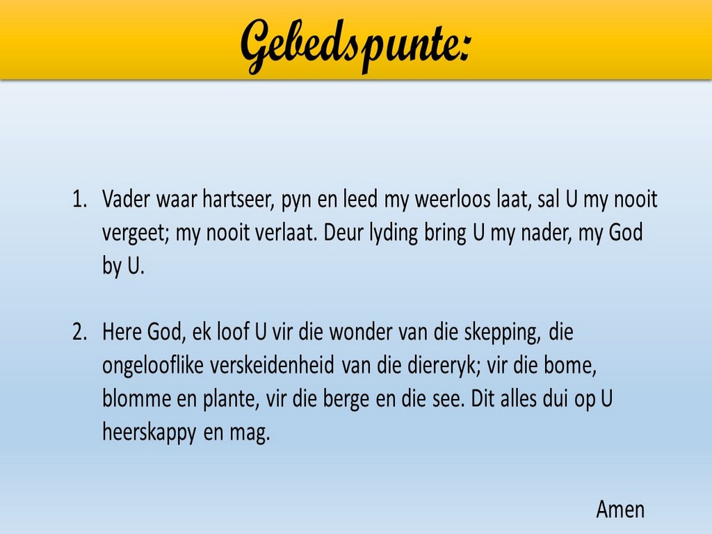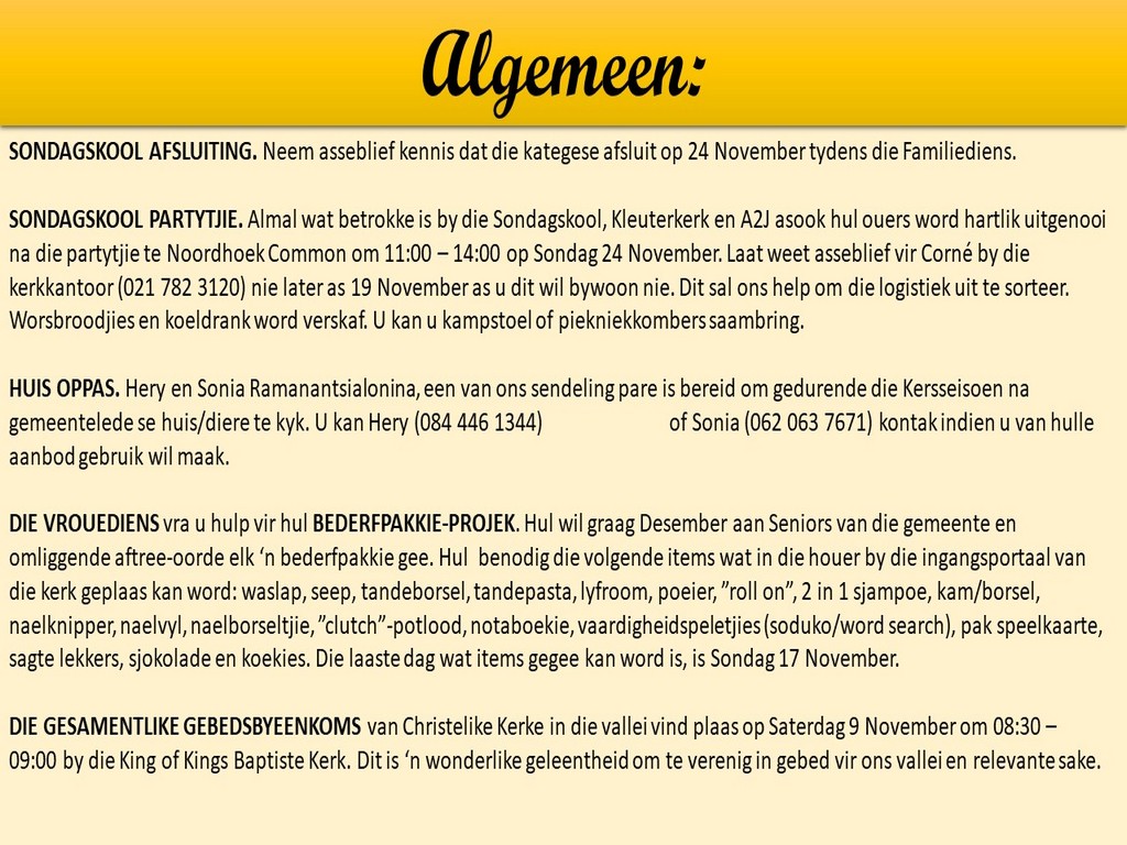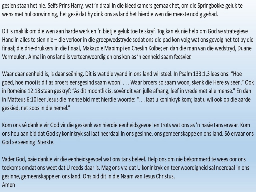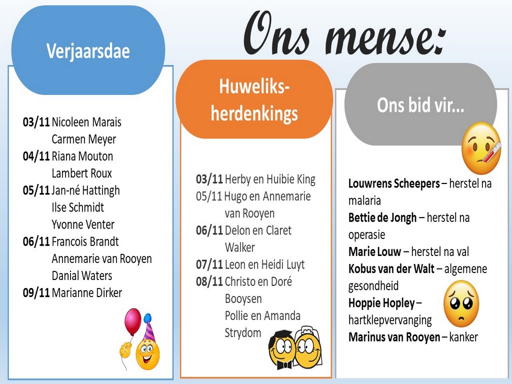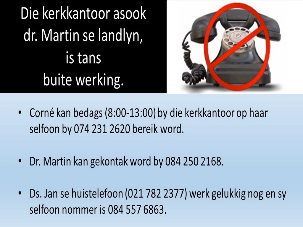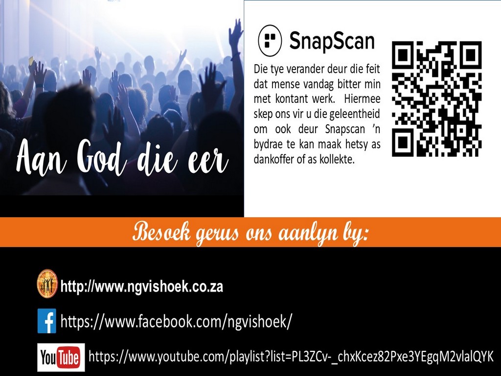 Om ons weeklikse nuusbrief te ontvang: Stuur 'n e-pos namedia@ngvishoek.co.za