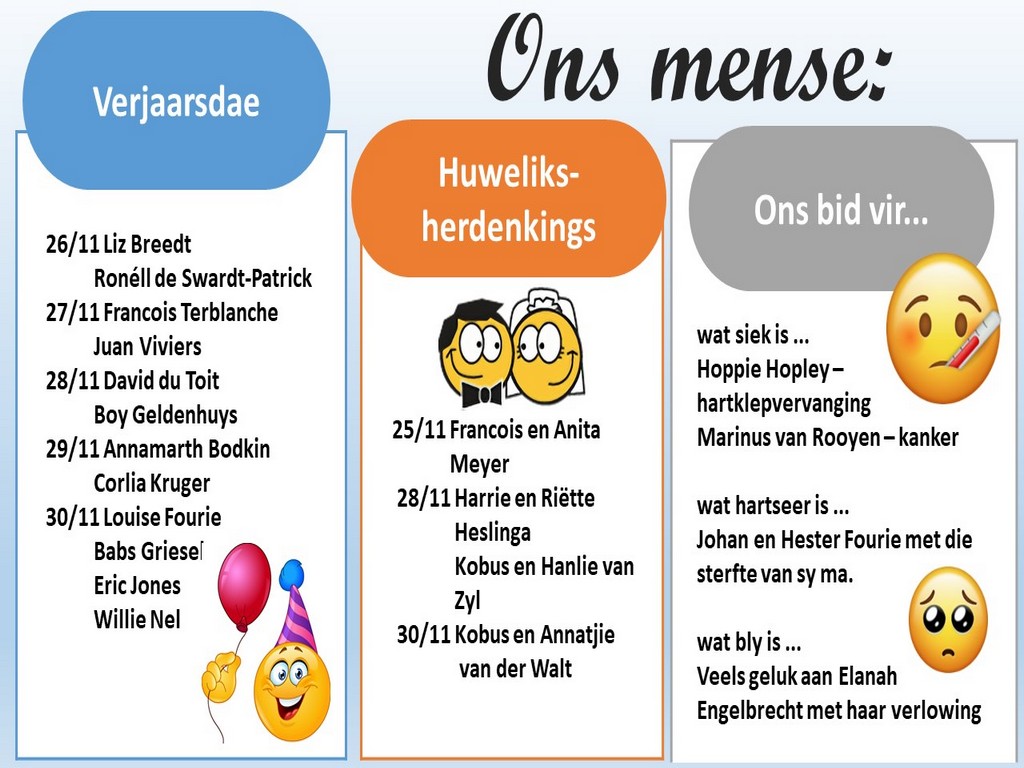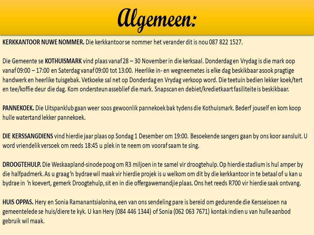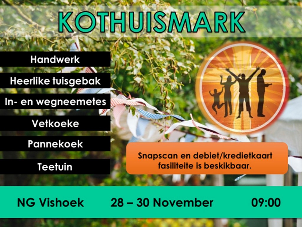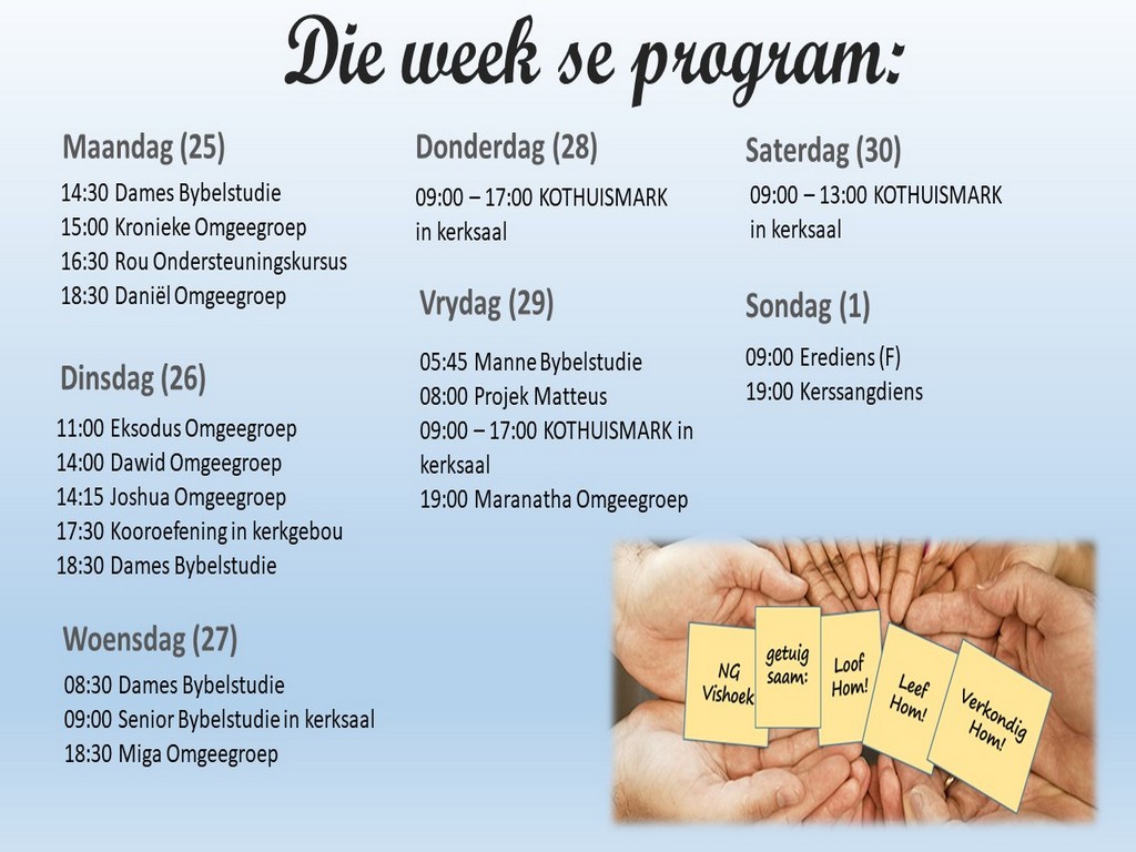 | Webtuiste:www.ngvishoek.co.za Facebook: NGVishoek Om ons weeklikse nuusbrief te ontvang: Stuur 'n e-pos namedia@ngvishoek.co.za | |