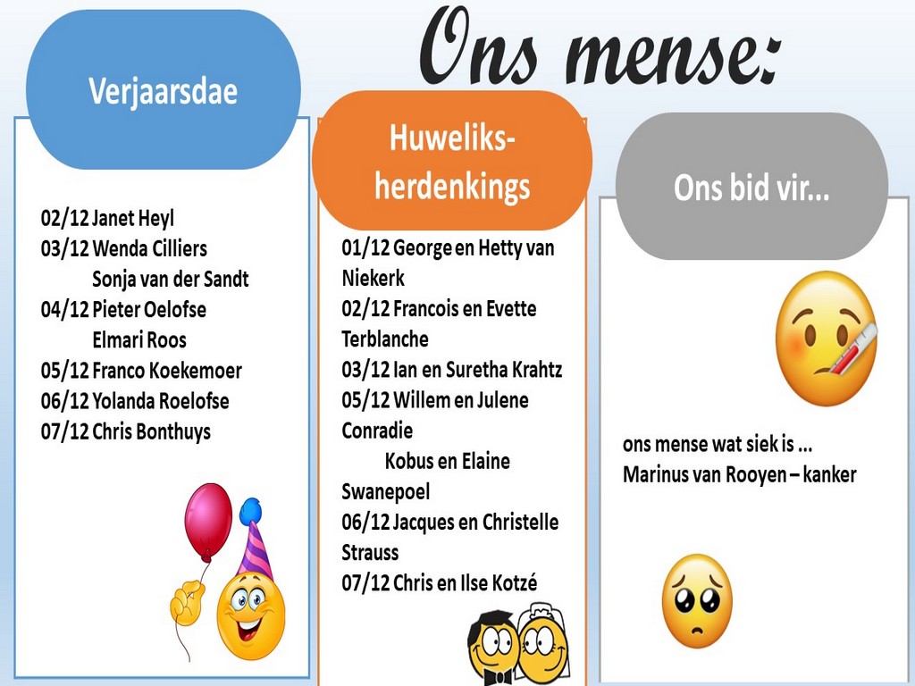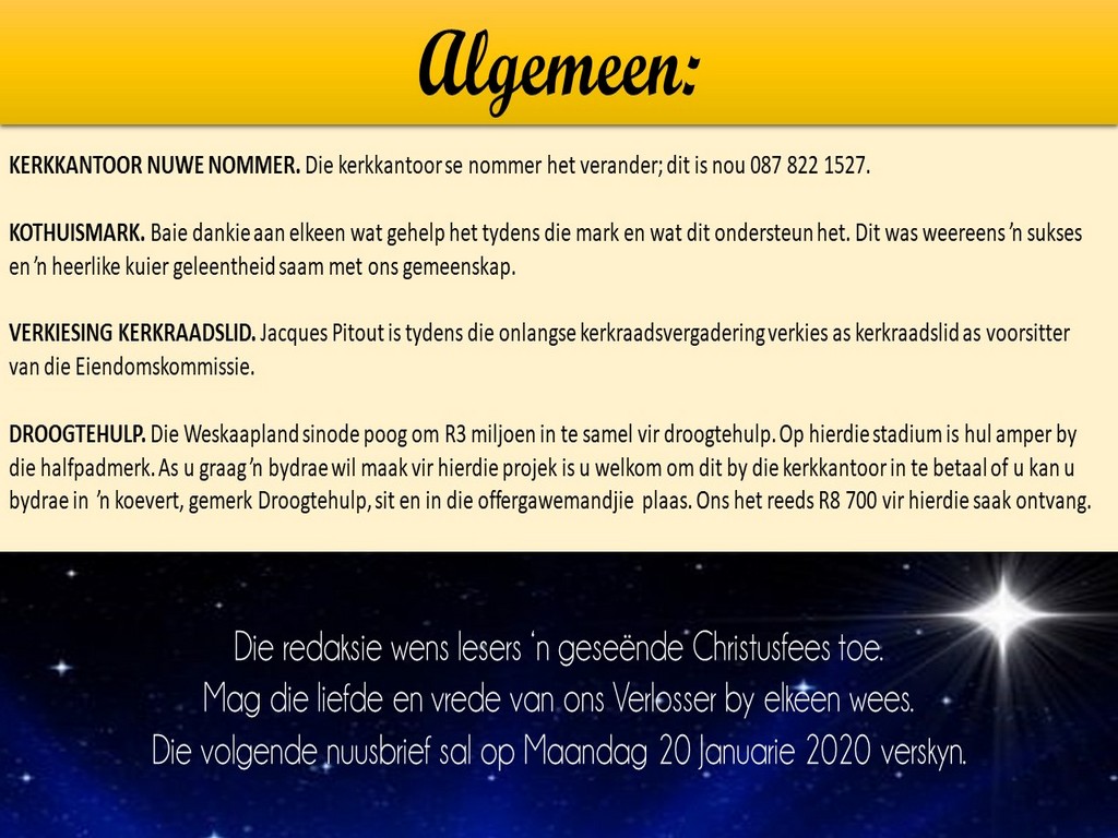 Om ons weeklikse nuusbrief te ontvang: Stuur 'n e-pos namedia@ngvishoek.co.za