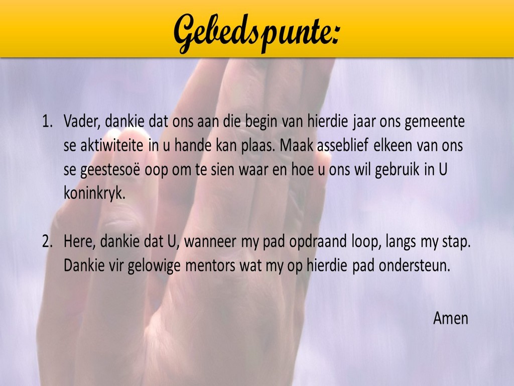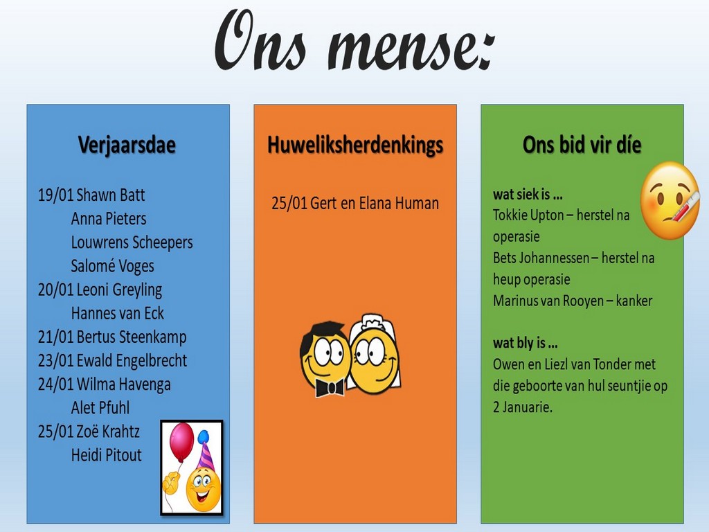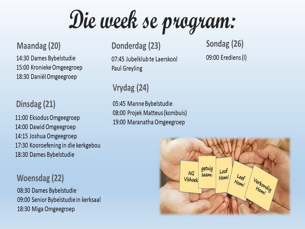 Om ons weeklikse nuusbrief te ontvang: Stuur 'n e-pos namedia@ngvishoek.co.za