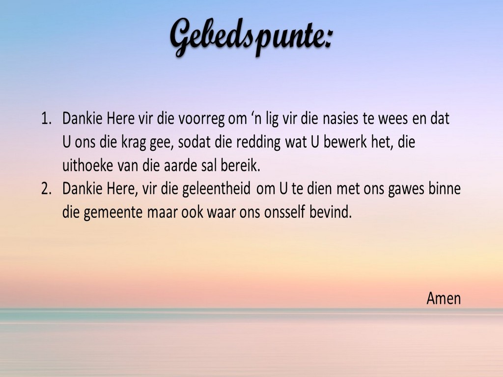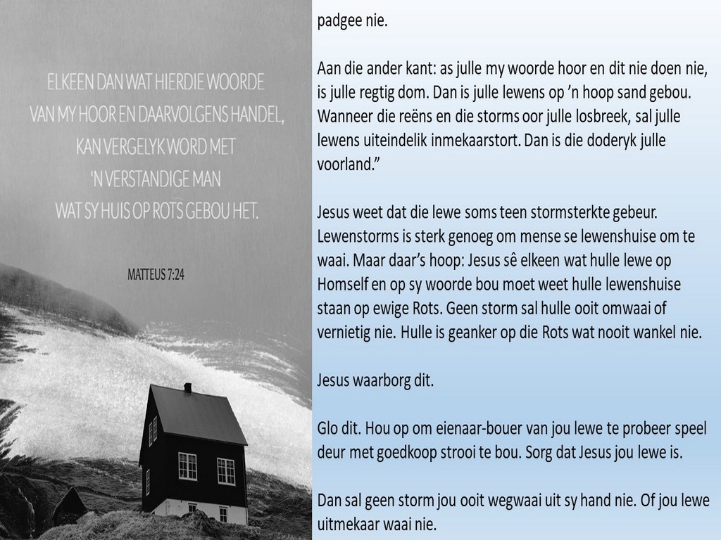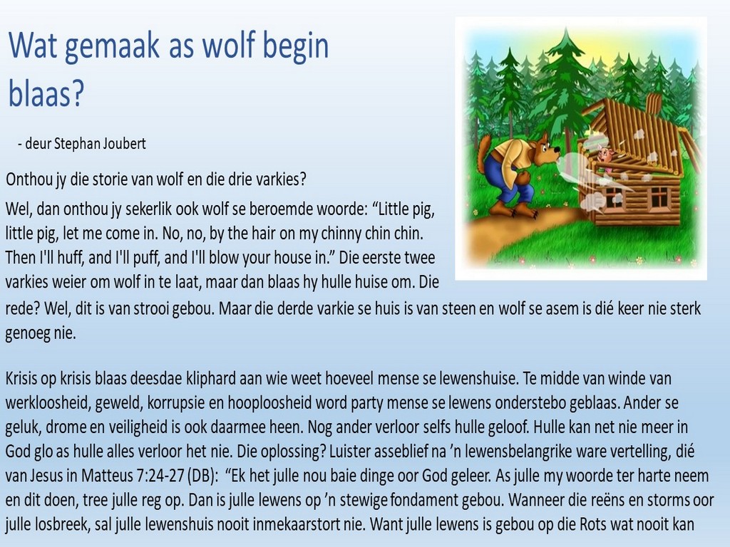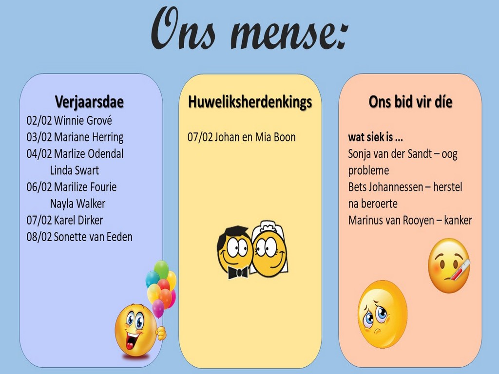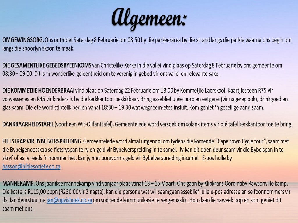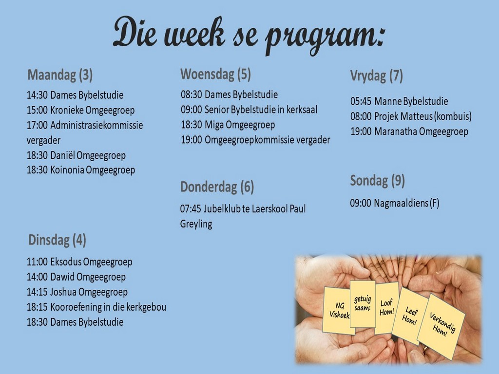 Om ons weeklikse nuusbrief te ontvang: Stuur 'n e-pos namedia@ngvishoek.co.za