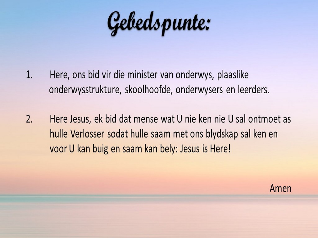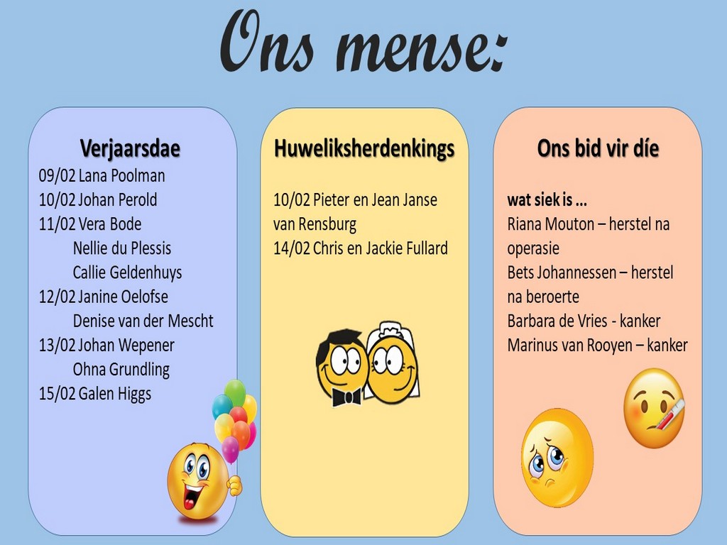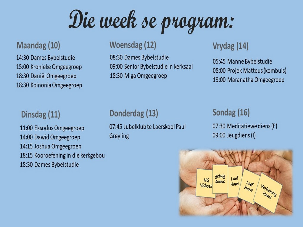 Om ons weeklikse nuusbrief te ontvang: Stuur 'n e-pos namedia@ngvishoek.co.za