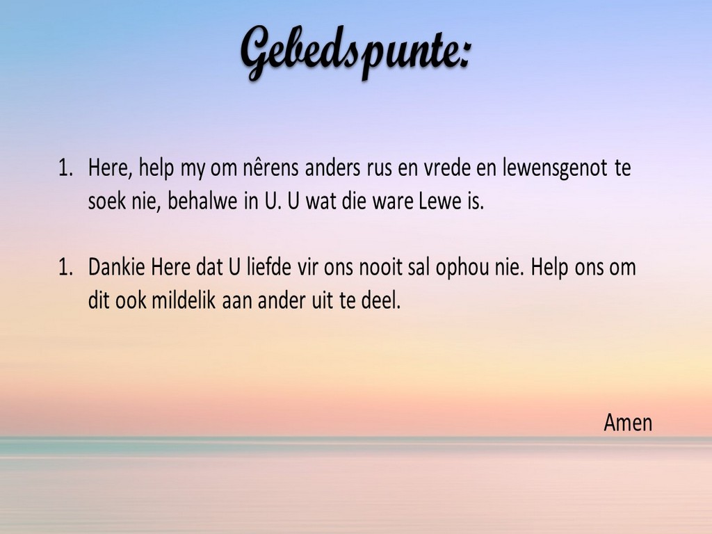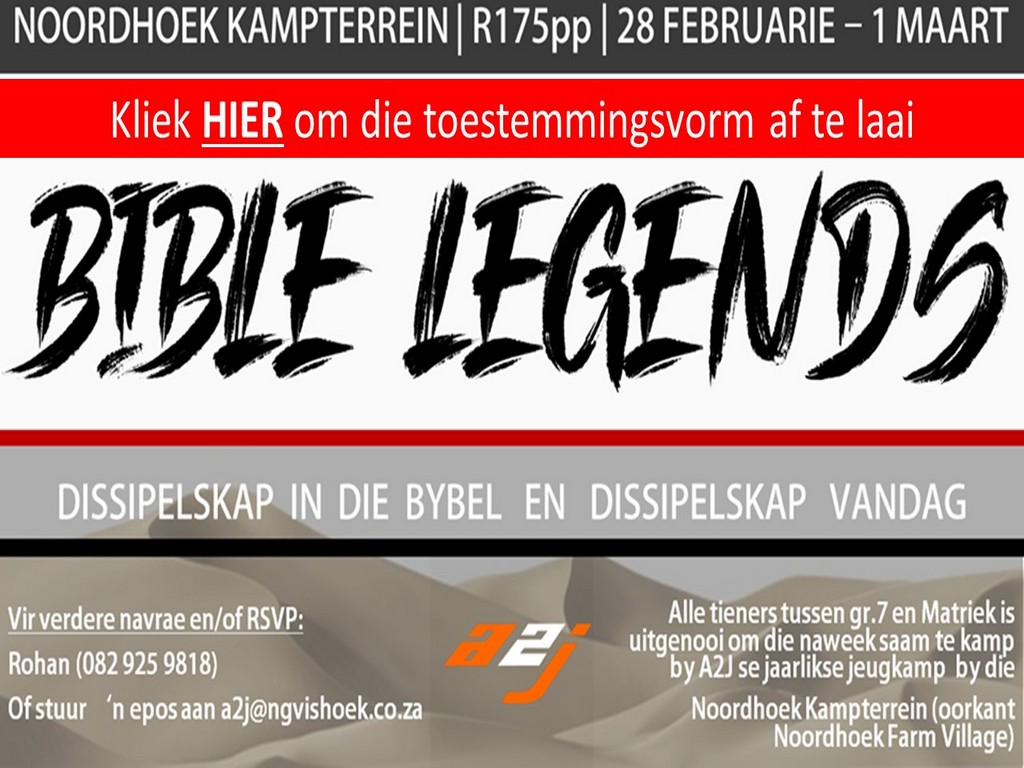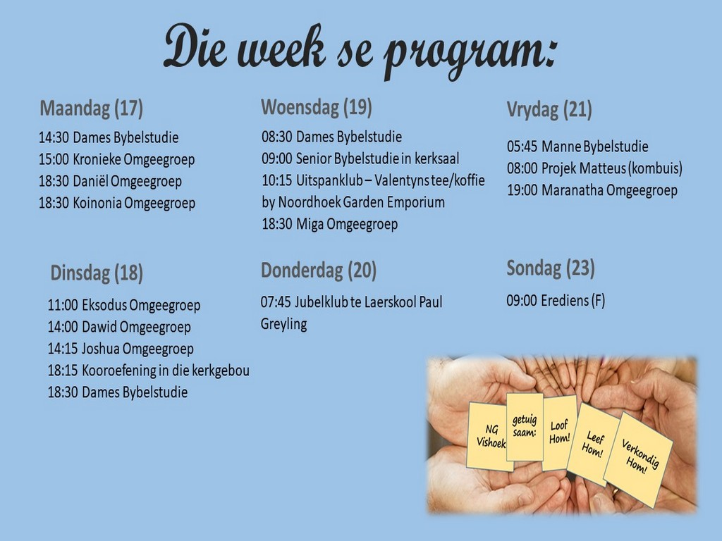 Om ons weeklikse nuusbrief te ontvang: Stuur 'n e-pos namedia@ngvishoek.co.za