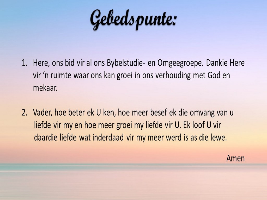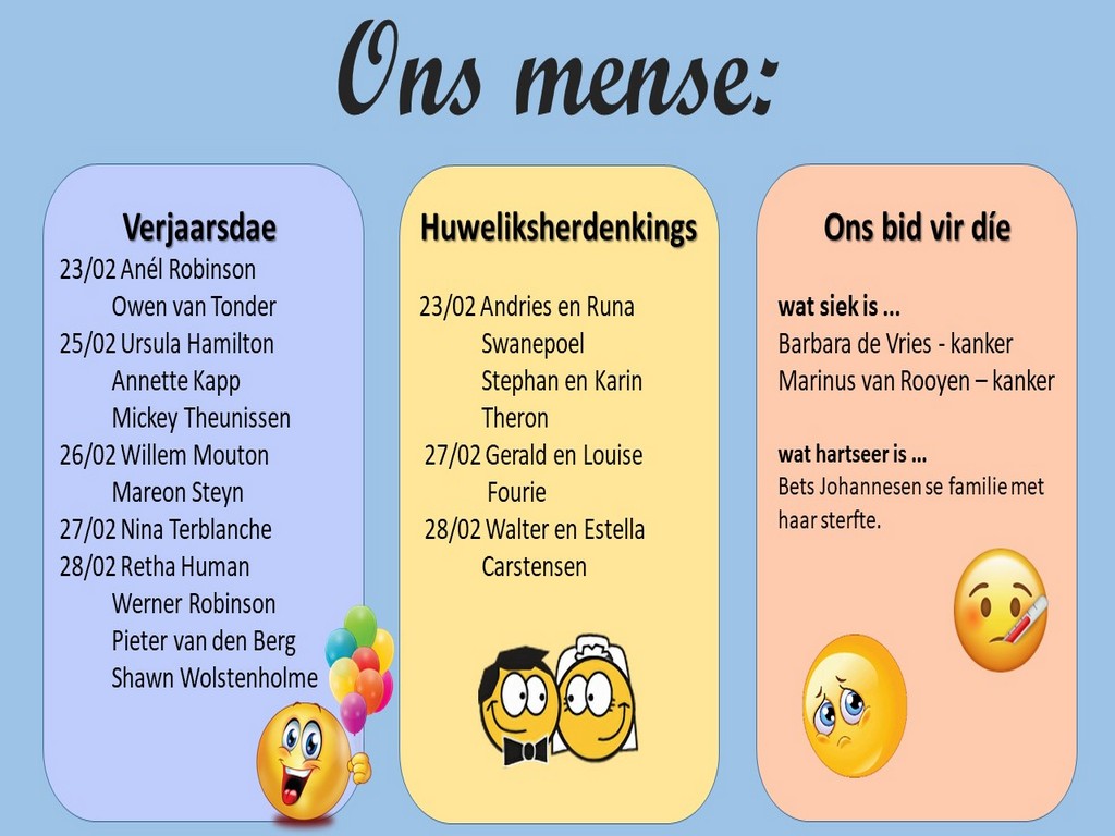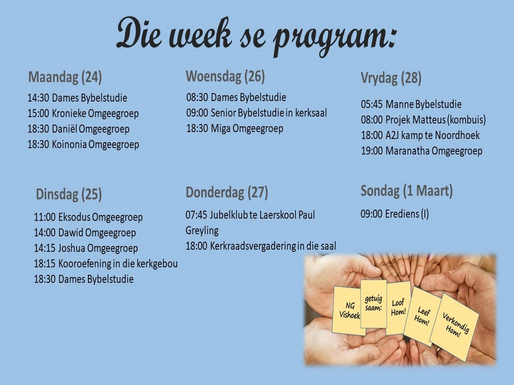 Om ons weeklikse nuusbrief te ontvang: Stuur 'n e-pos namedia@ngvishoek.co.za