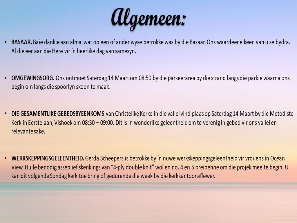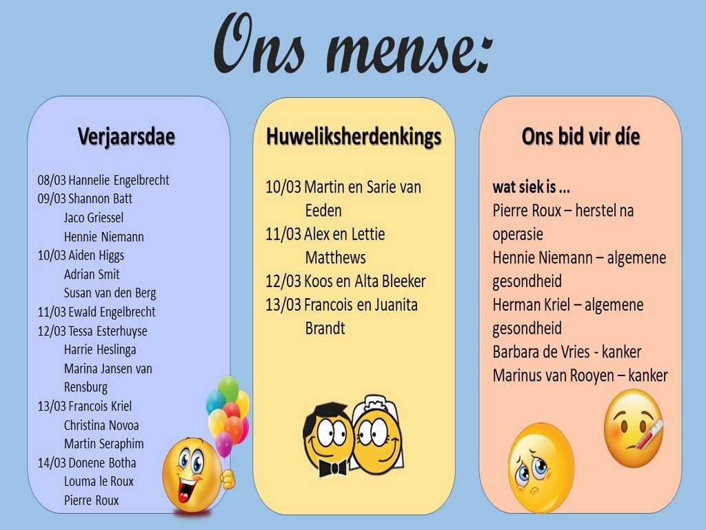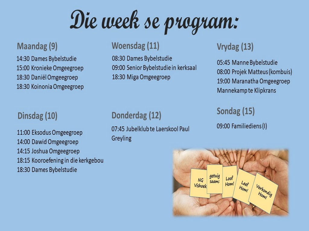 Om ons weeklikse nuusbrief te ontvang: Stuur 'n e-pos namedia@ngvishoek.co.za