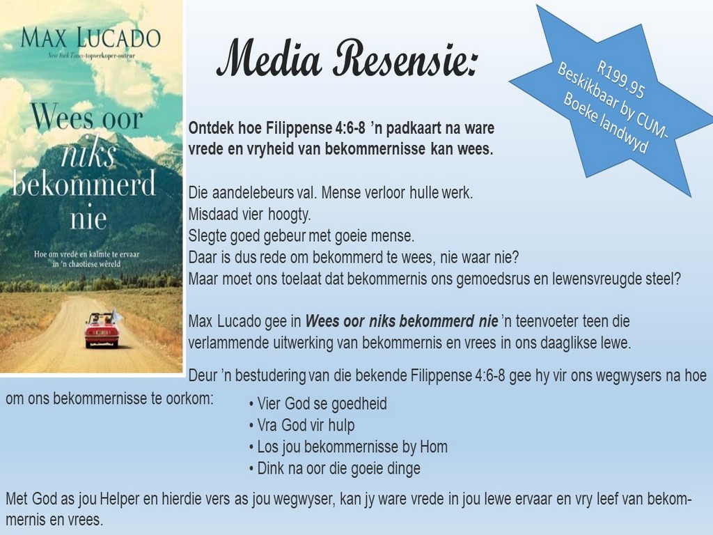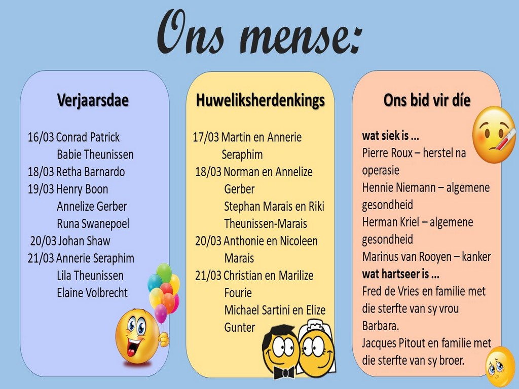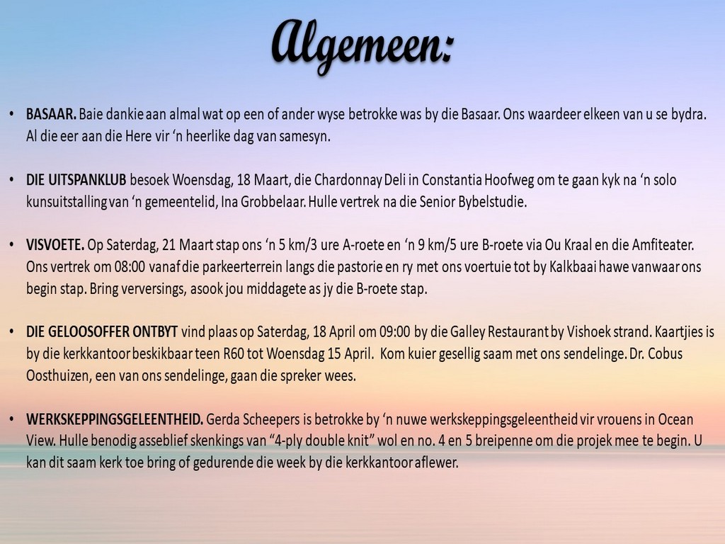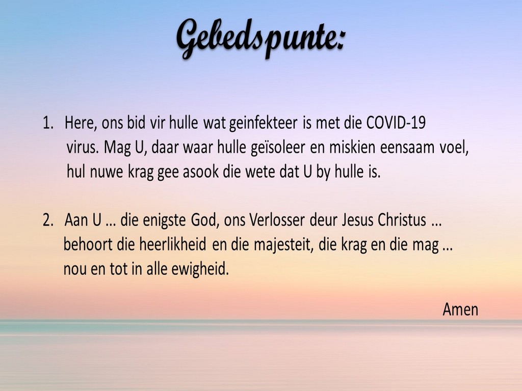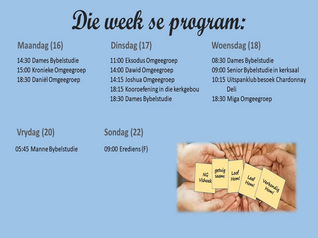 Om ons weeklikse nuusbrief te ontvang: Stuur 'n e-pos namedia@ngvishoek.co.za