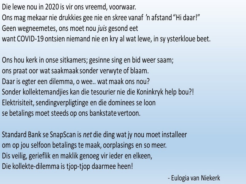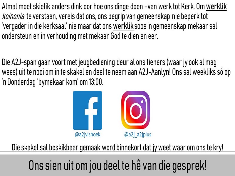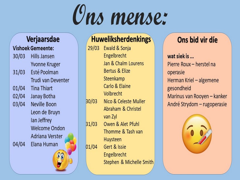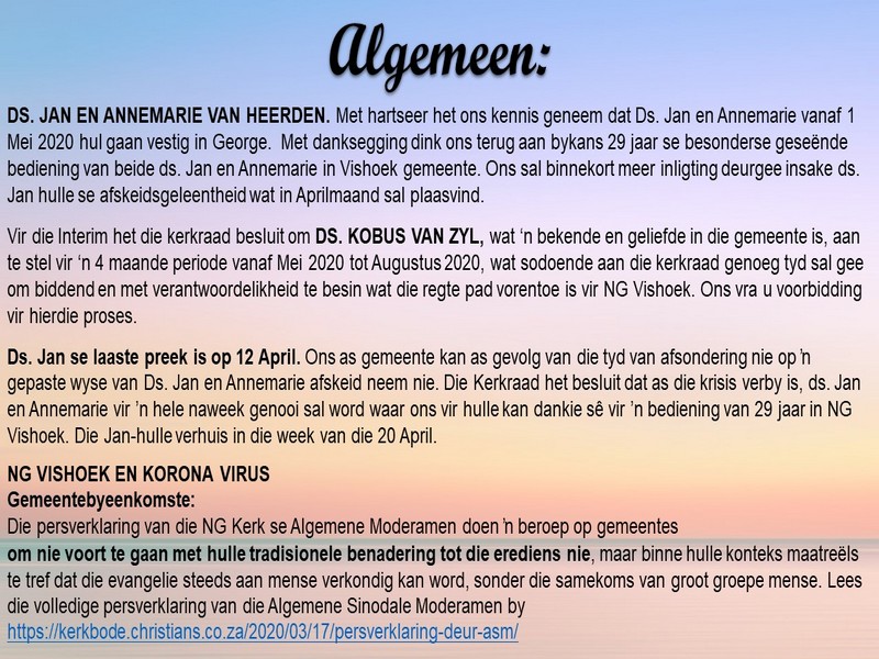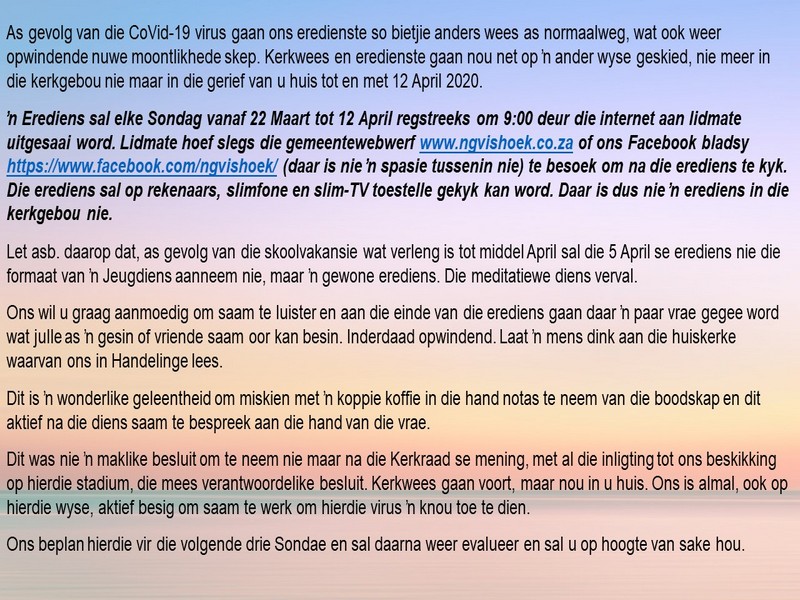 | Webtuiste:www.ngvishoek.co.za Facebook: NGVishoek Om ons weeklikse nuusbrief te ontvang: Stuur 'n e-pos namedia@ngvishoek.co.za | |