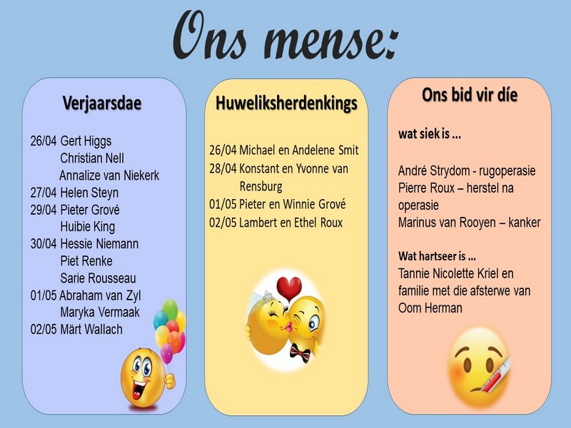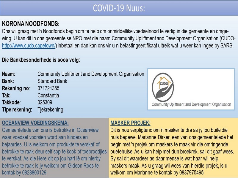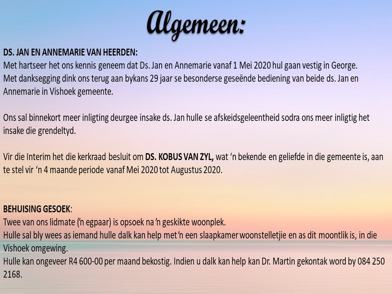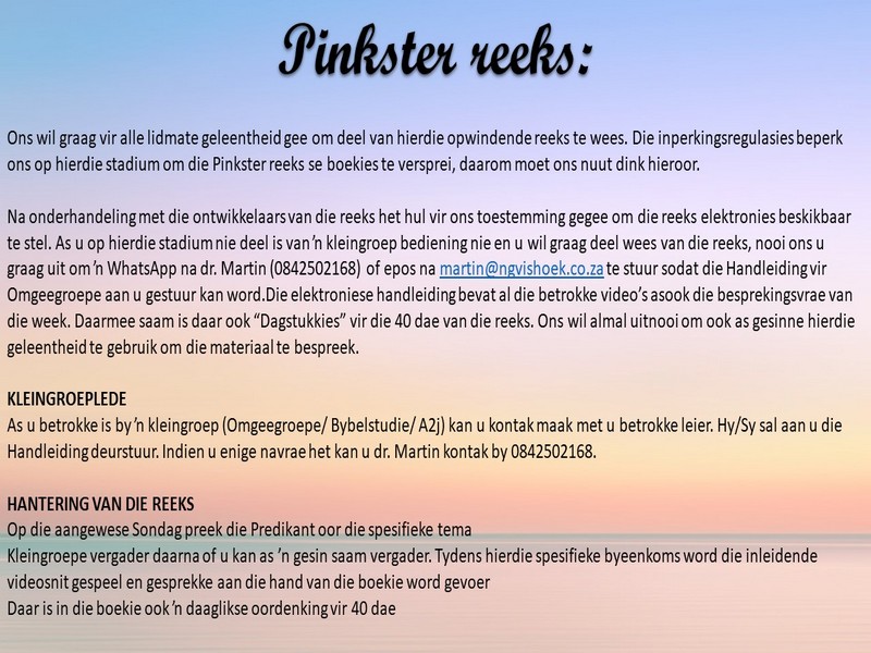 | Webtuiste:www.ngvishoek.co.za Facebook: NGVishoek Om ons weeklikse nuusbrief te ontvang: Stuur 'n e-pos namedia@ngvishoek.co.za | |