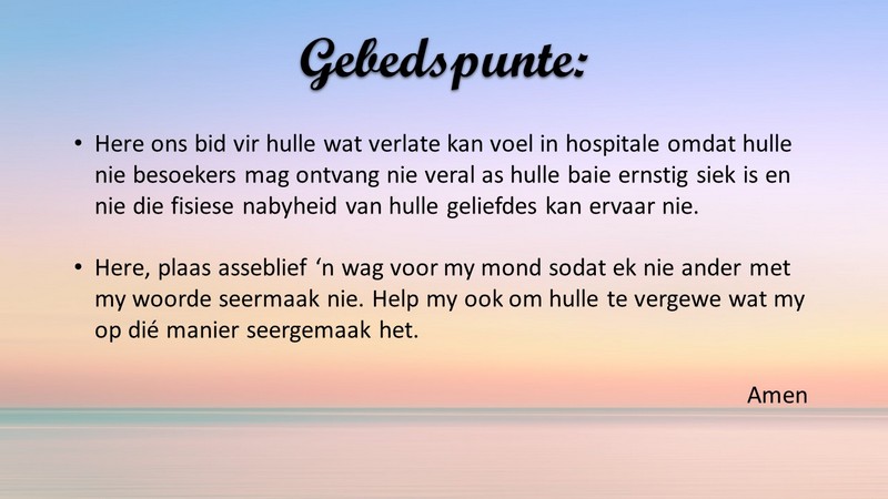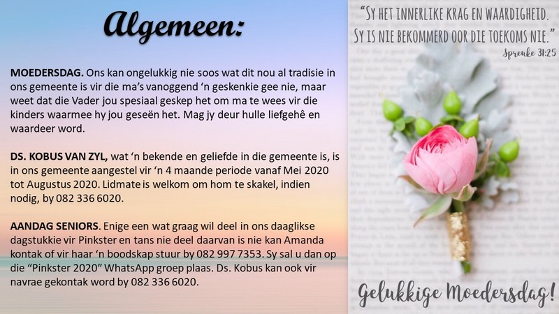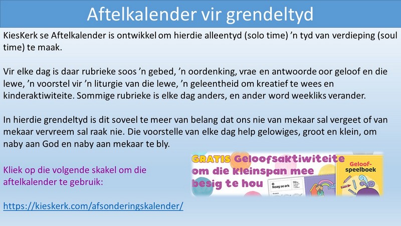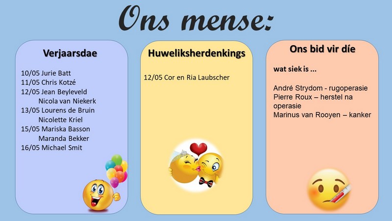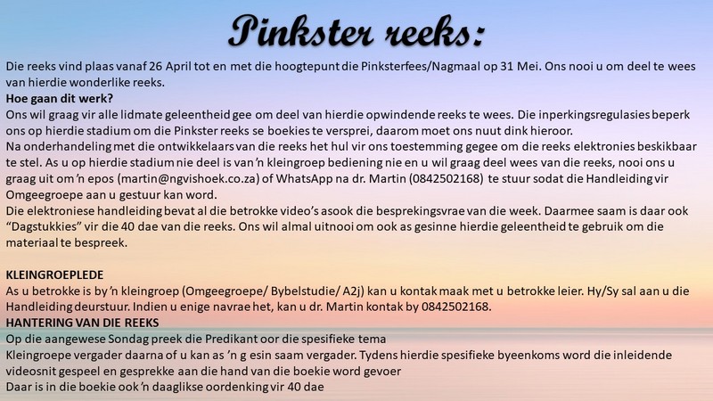 Om ons weeklikse nuusbrief te ontvang: Stuur 'n e-pos namedia@ngvishoek.co.za
