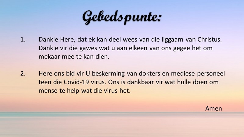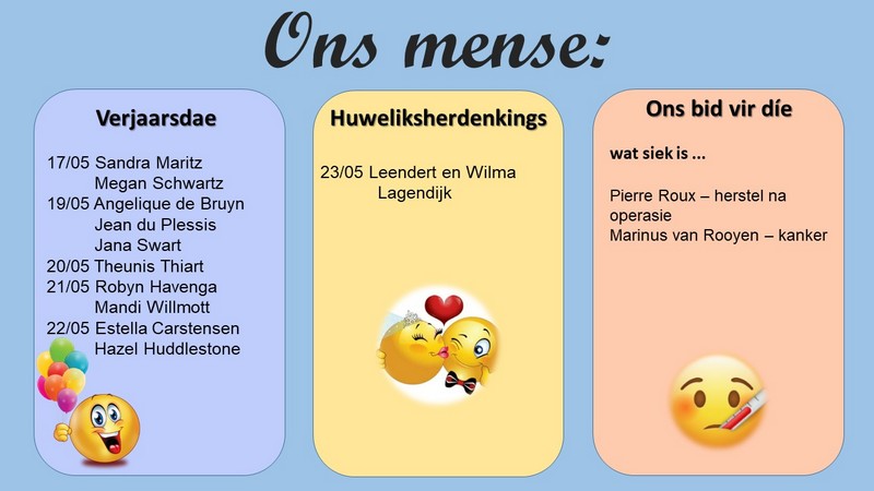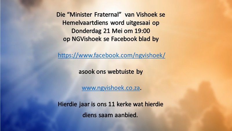 Om ons weeklikse nuusbrief te ontvang: Stuur 'n e-pos namedia@ngvishoek.co.za