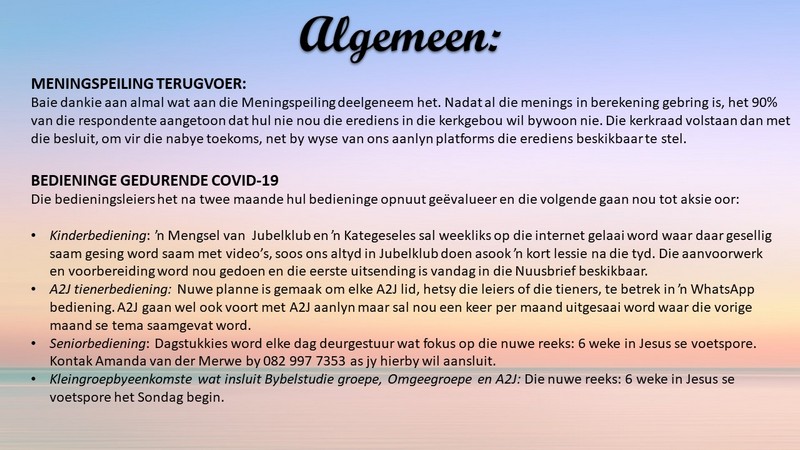 | Webtuiste: 'https://www.ngvishoek.co.za Facebook: NGVishoek Om ons weeklikse nuusbrief te ontvang: Stuur 'n e-pos namedia@ngvishoek.co.za | |