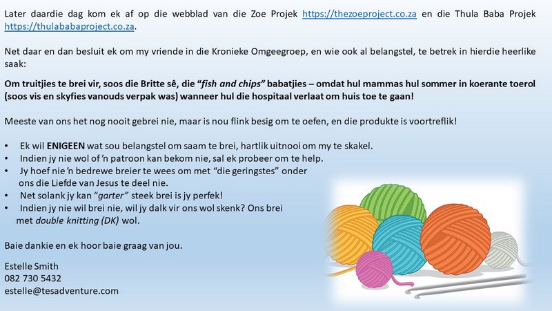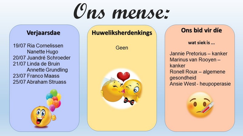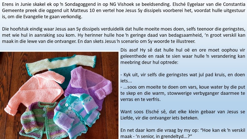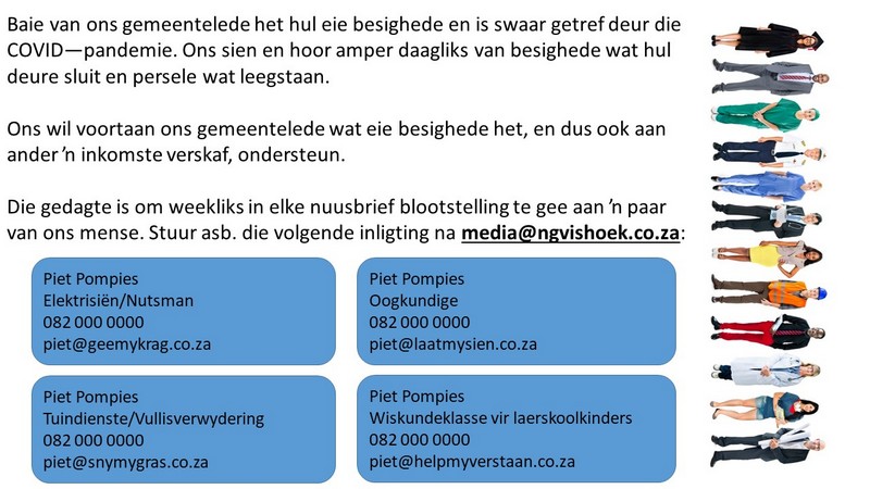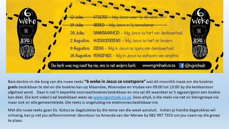 Om ons weeklikse nuusbrief te ontvang: Stuur 'n e-pos namedia@ngvishoek.co.za