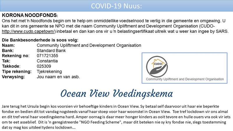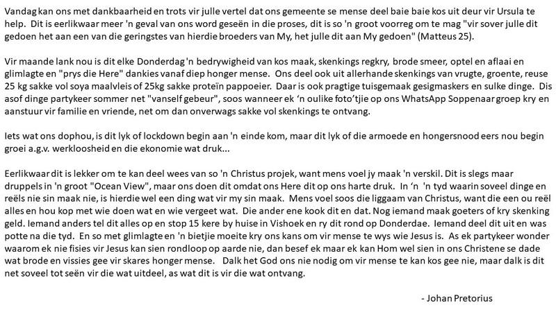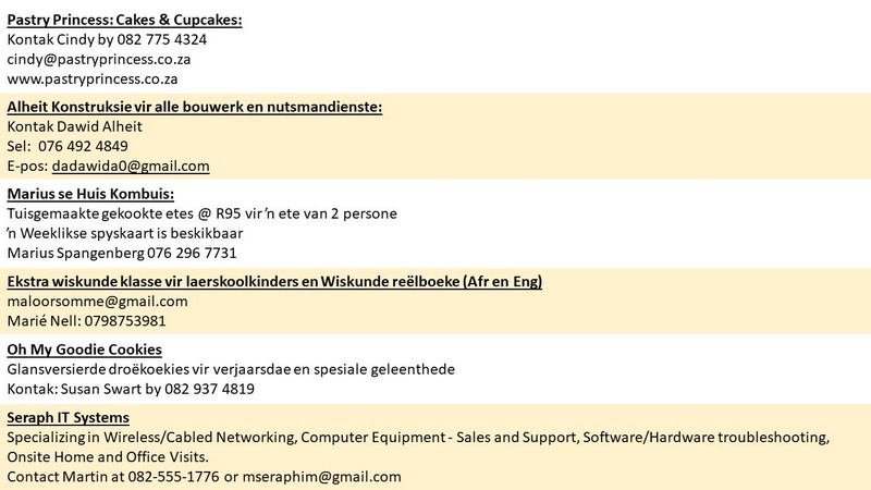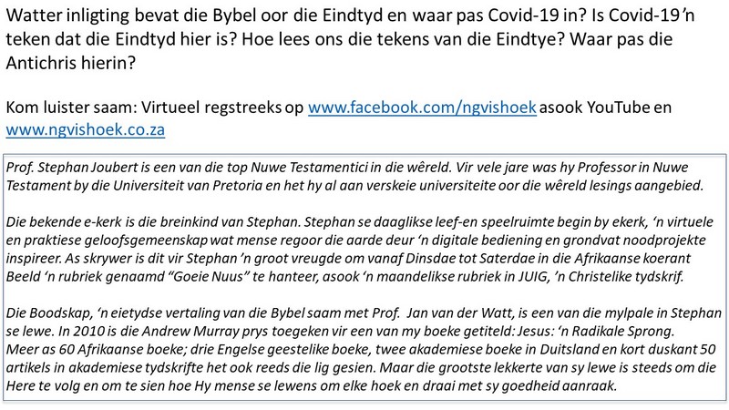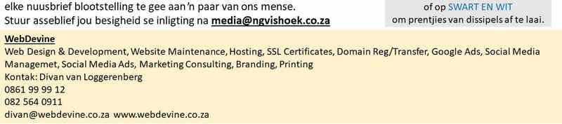 Om ons weeklikse nuusbrief te ontvang: Stuur 'n e-pos namedia@ngvishoek.co.za