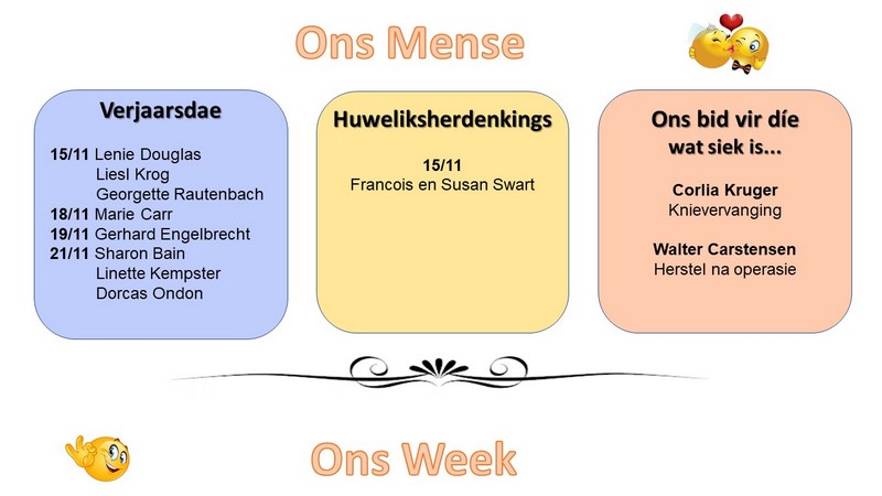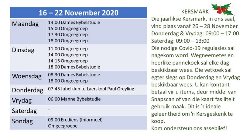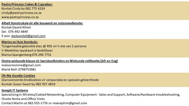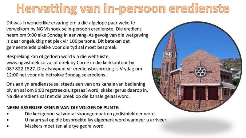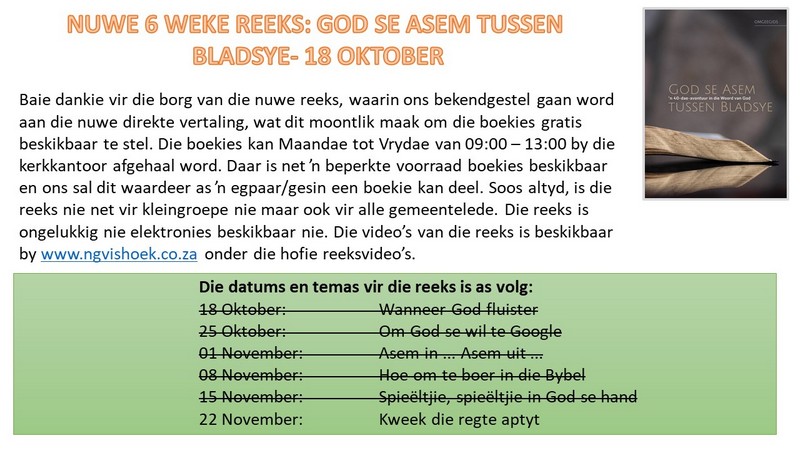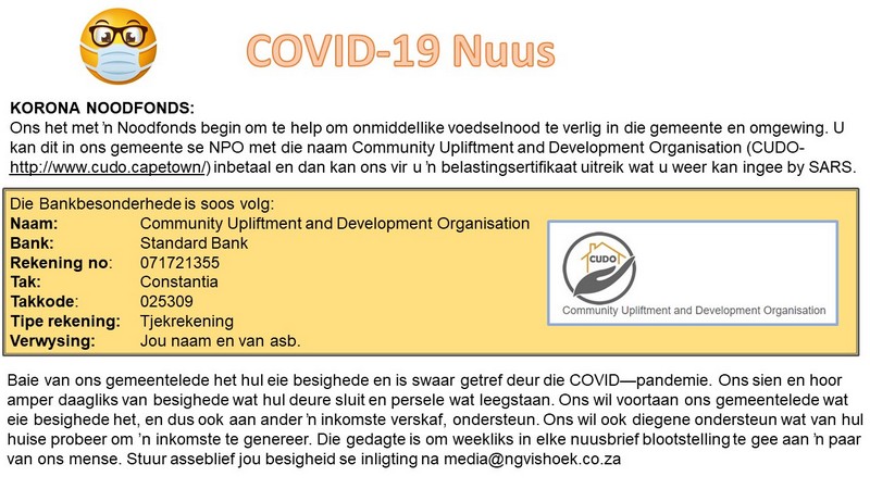 Om ons weeklikse nuusbrief te ontvang: Stuur 'n e-pos namedia@ngvishoek.co.za