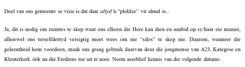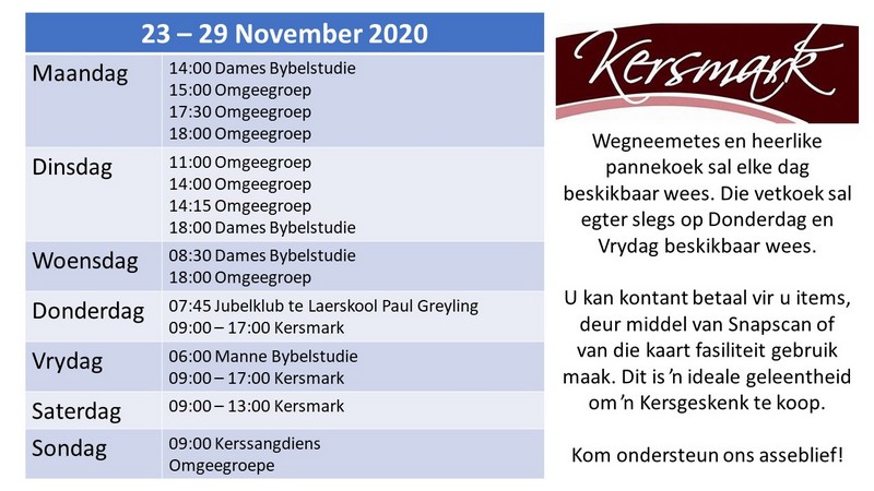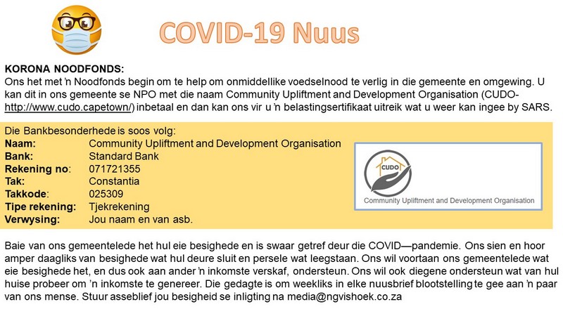| Webtuiste:https://www.ngvishoek.co.za Facebook: NGVishoek Om ons weeklikse nuusbrief te ontvang: Stuur 'n e-pos namedia@ngvishoek.co.za | |