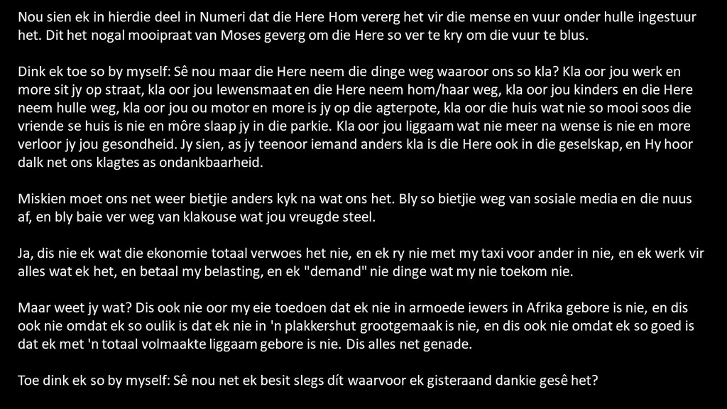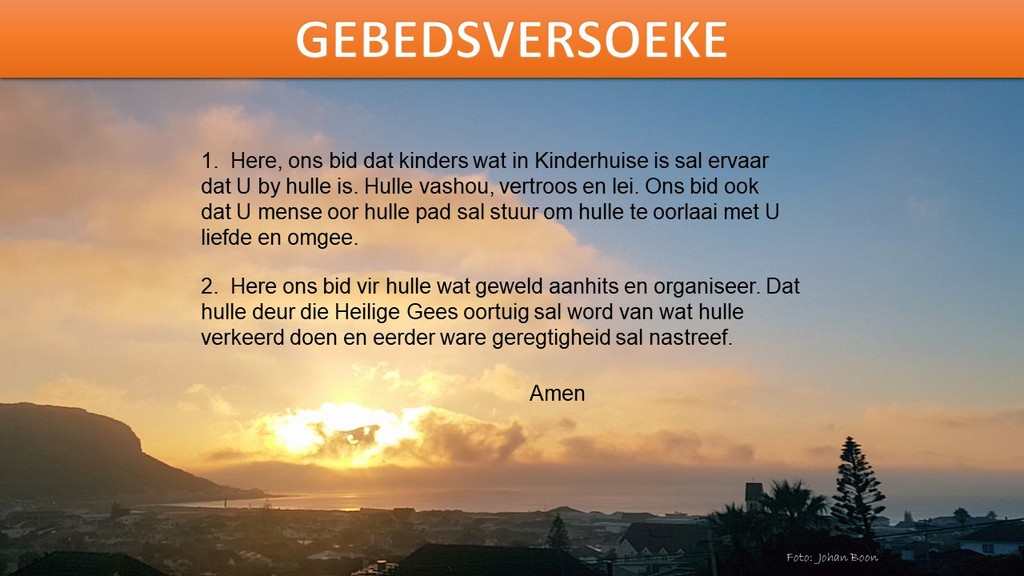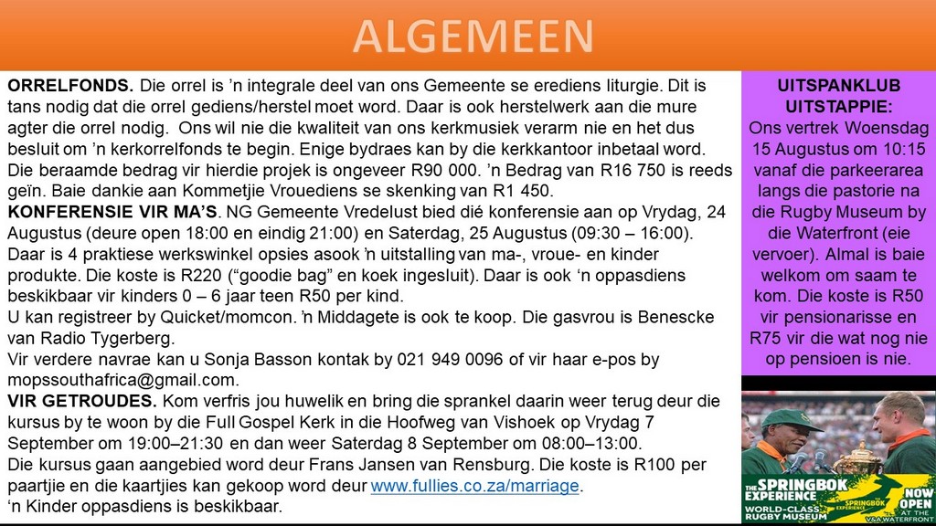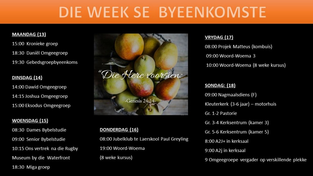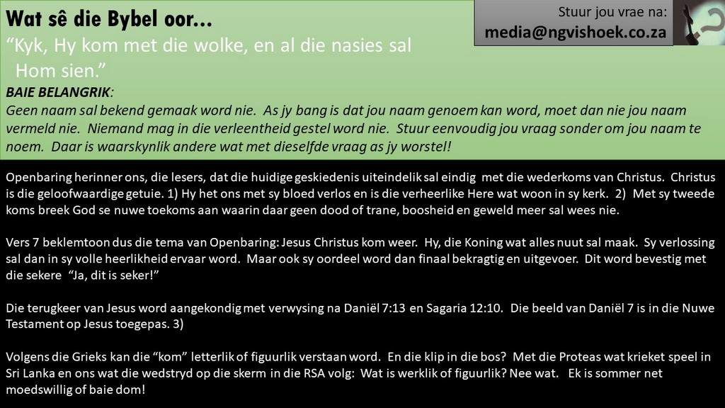 Om ons weeklikse nuusbrief te ontvang: Stuur 'n e-pos namedia@ngvishoek.co.za