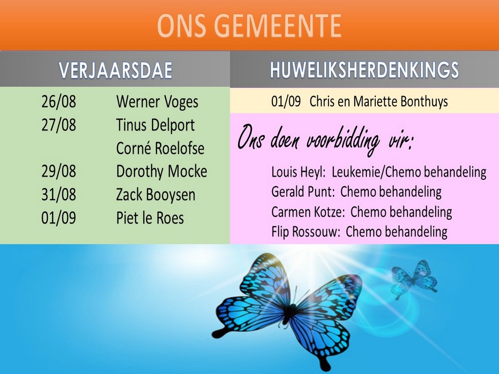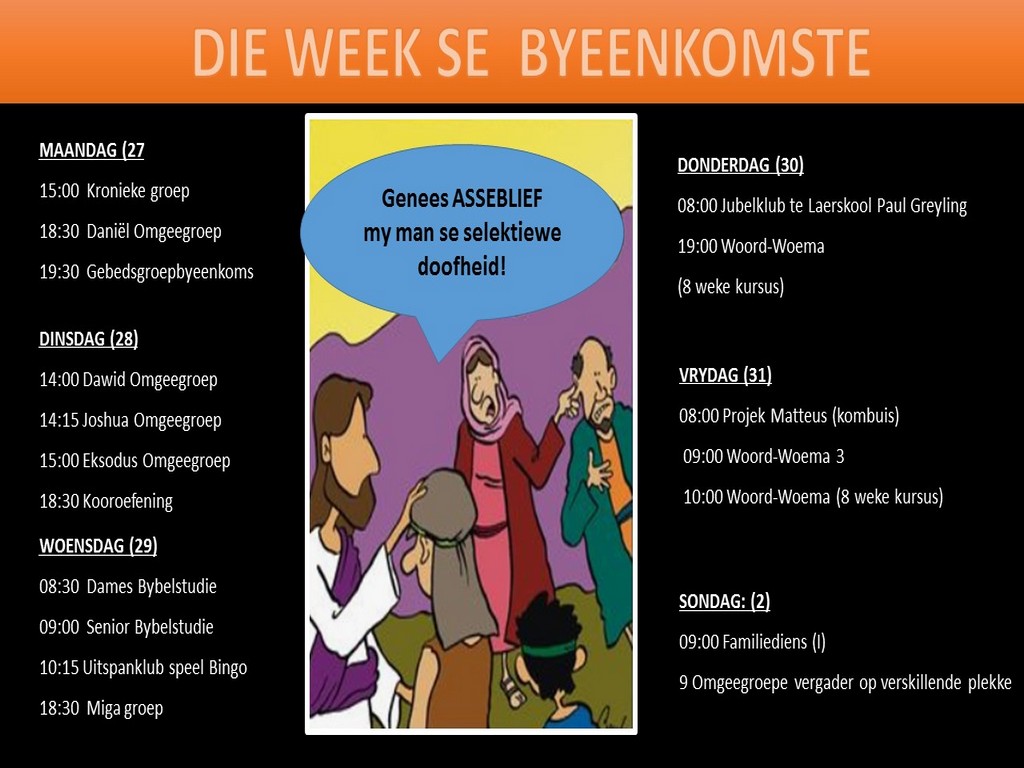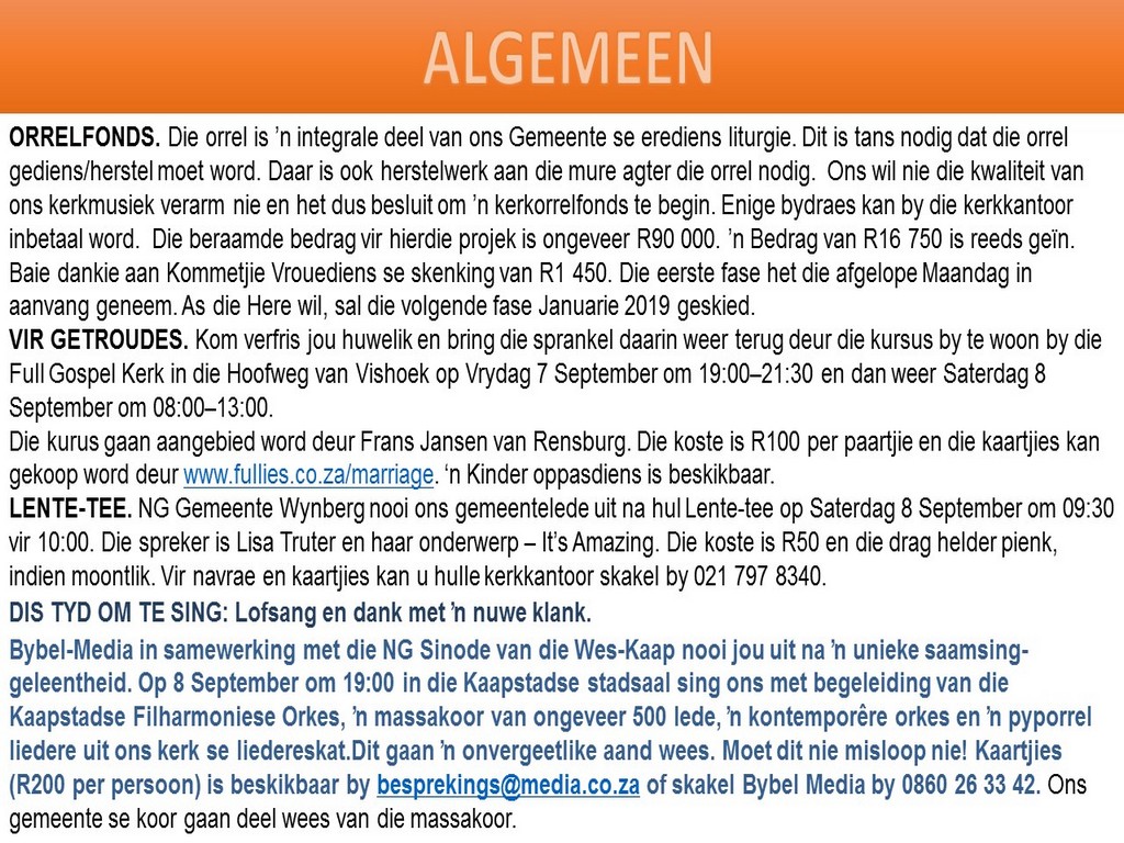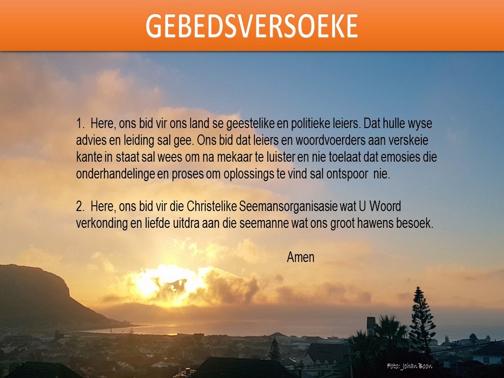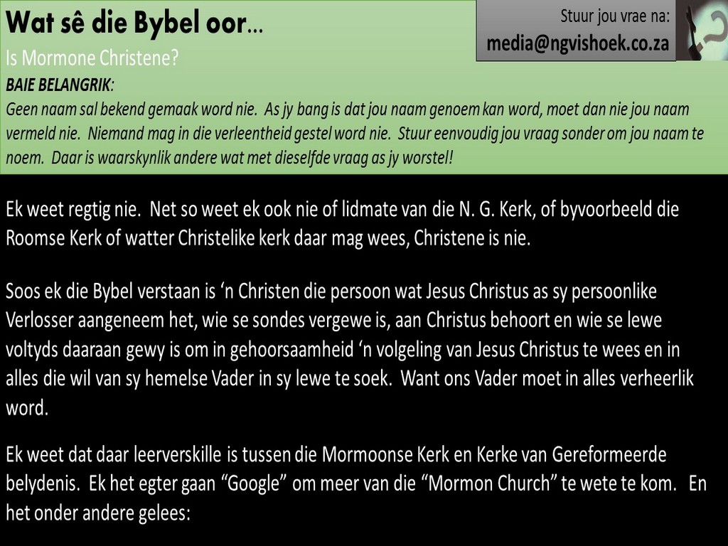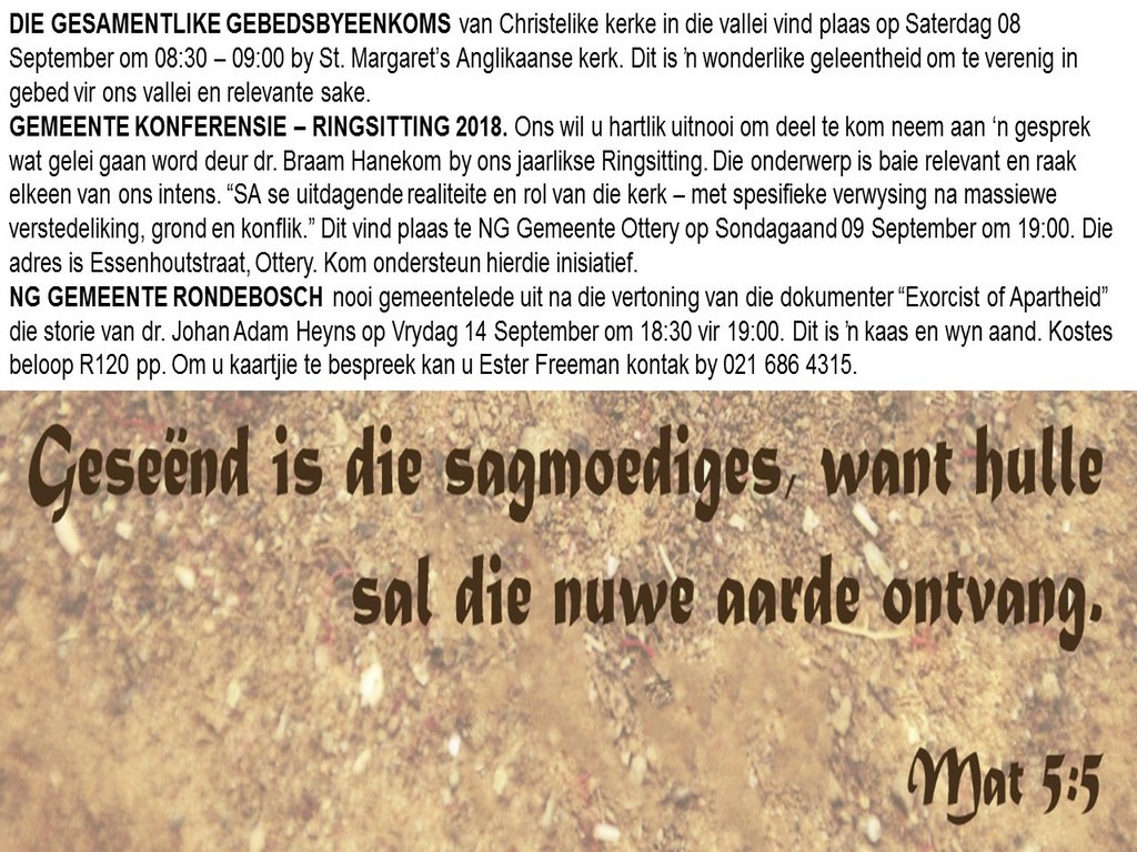 Om ons weeklikse nuusbrief te ontvang: Stuur 'n e-pos namedia@ngvishoek.co.za