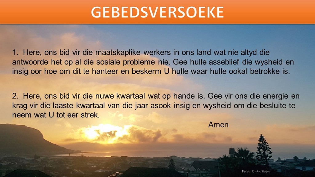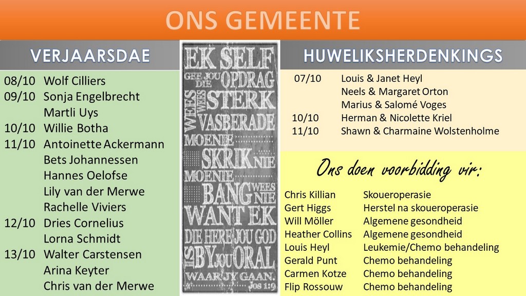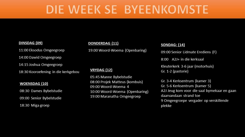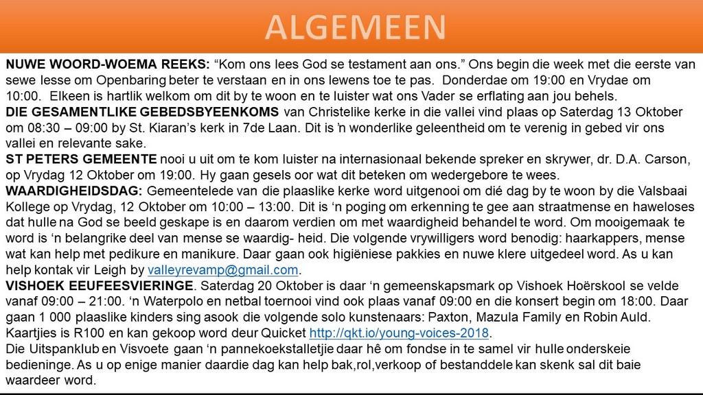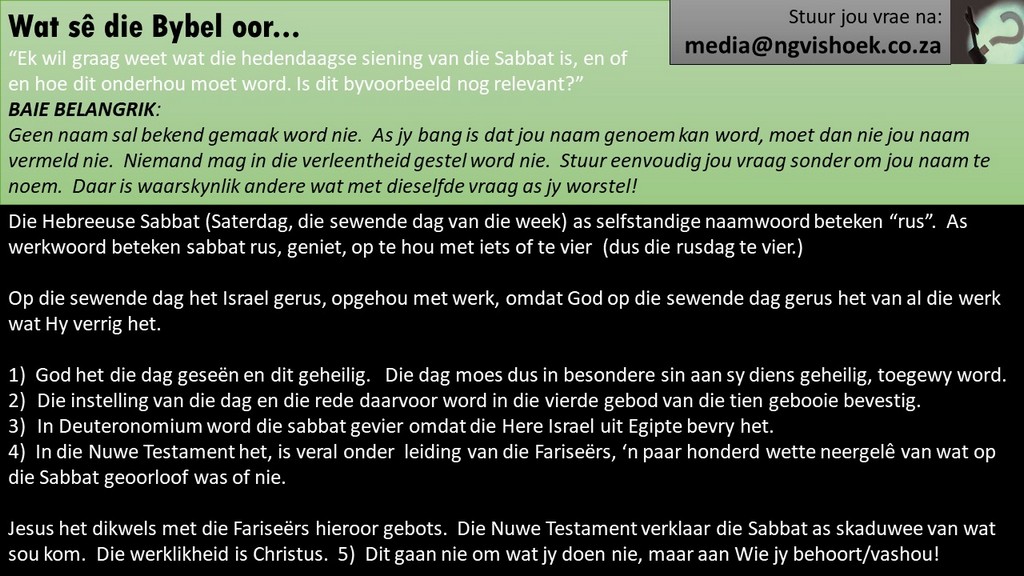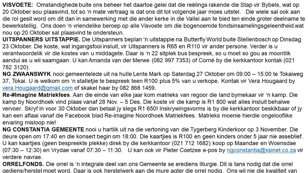 Om ons weeklikse nuusbrief te ontvang: Stuur 'n e-pos namedia@ngvishoek.co.za