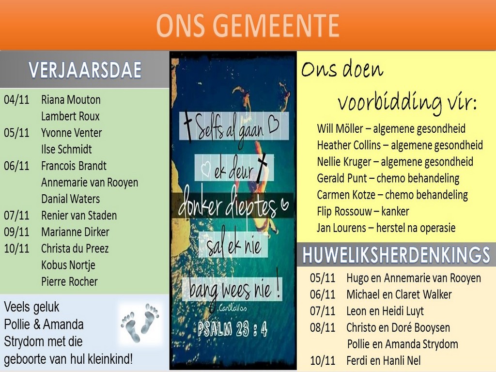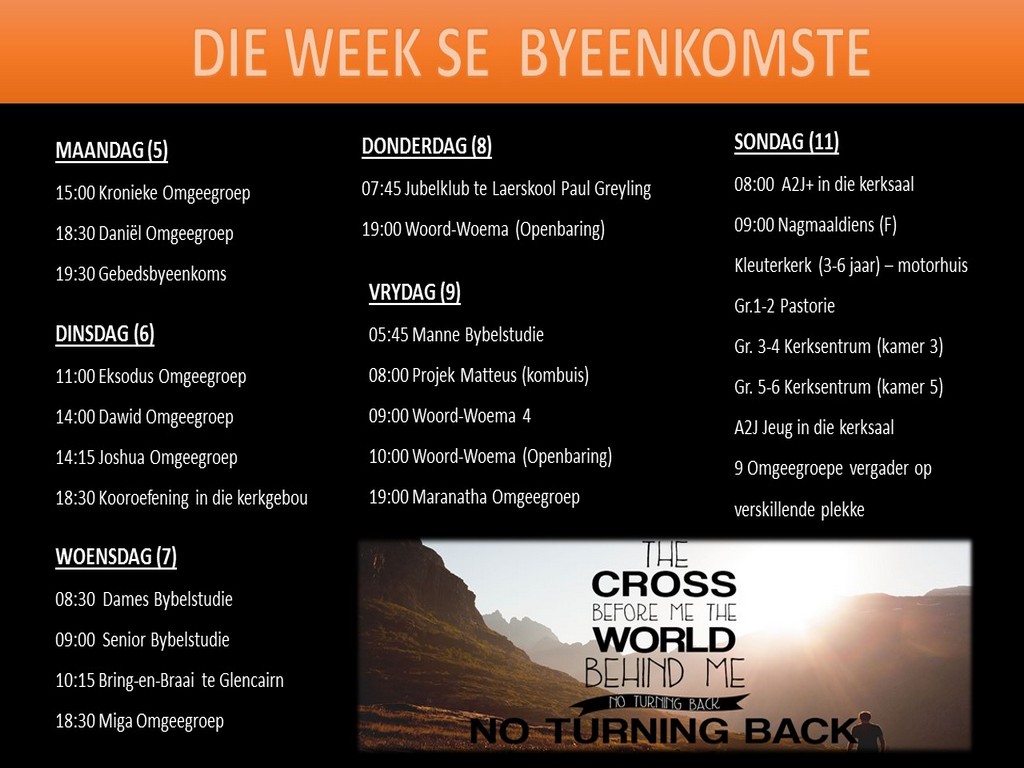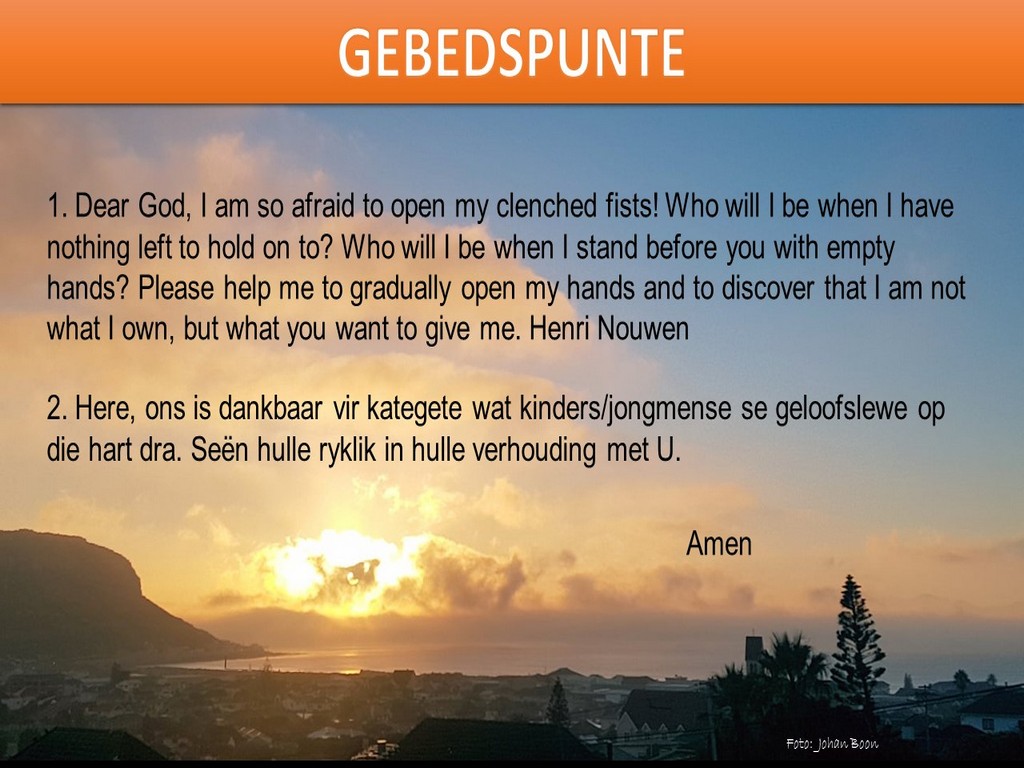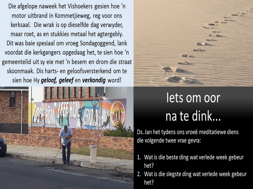 Om ons weeklikse nuusbrief te ontvang: Stuur 'n e-pos namedia@ngvishoek.co.za