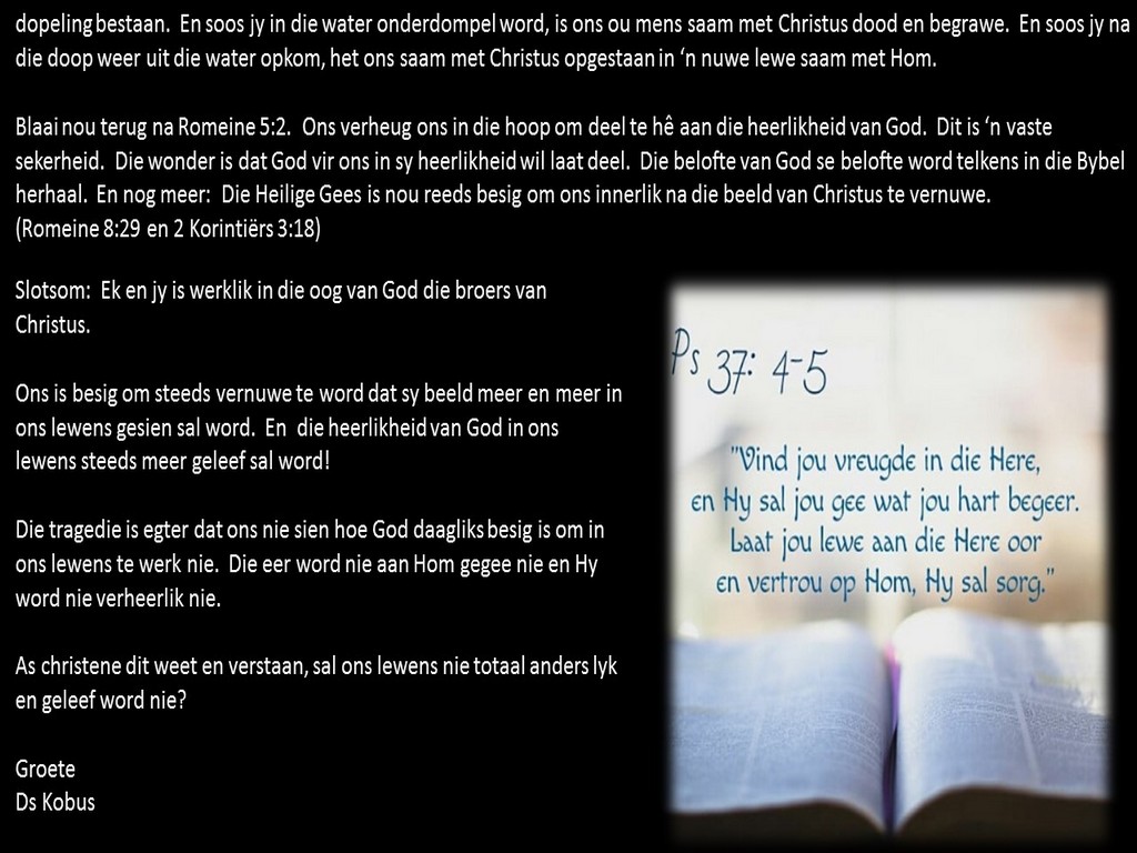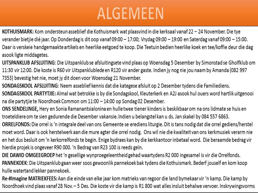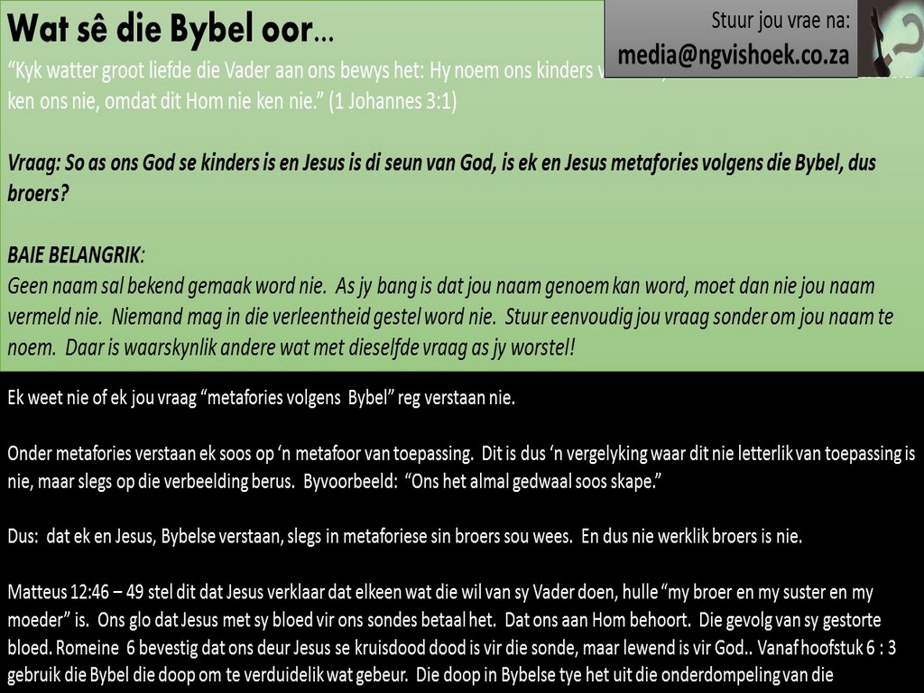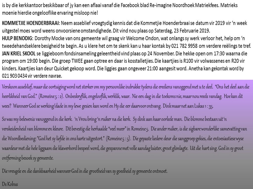 | Webtuiste:www.ngvishoek.co.za Facebook: NGVishoek Om ons weeklikse nuusbrief te ontvang: Stuur 'n e-pos namedia@ngvishoek.co.za |