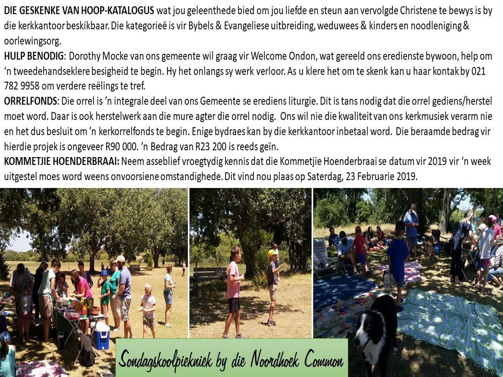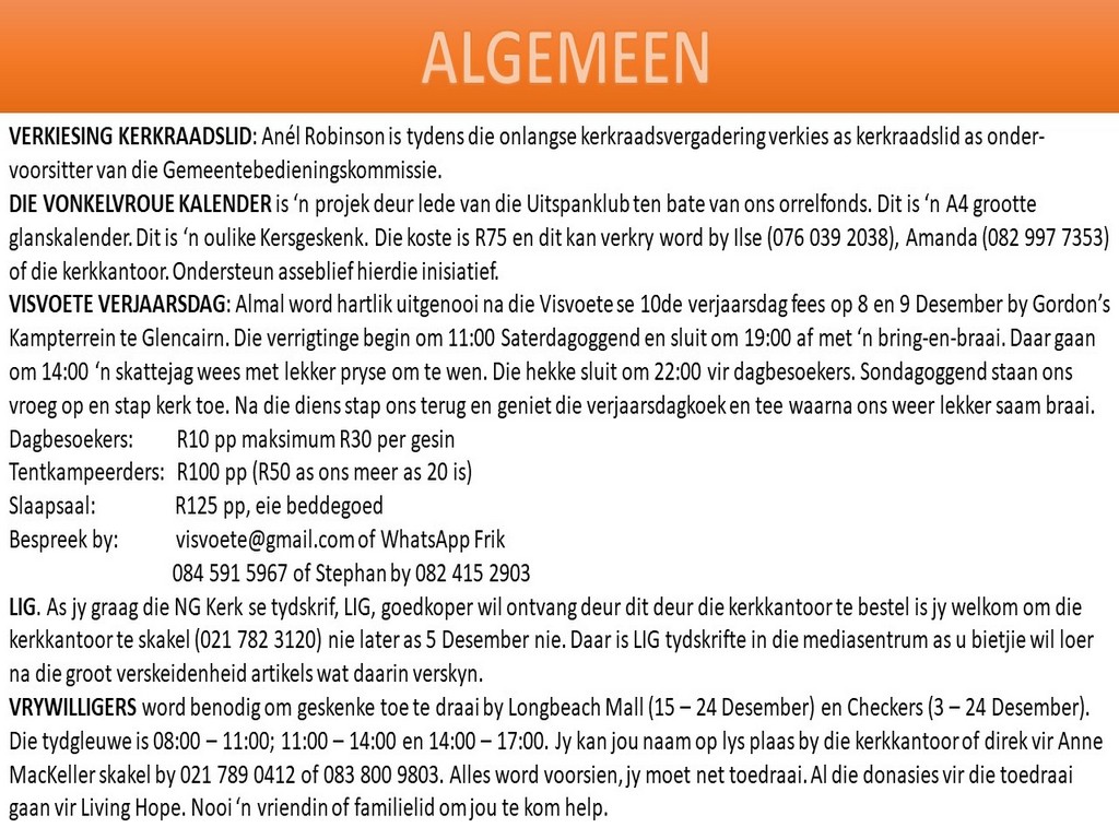 Om ons weeklikse nuusbrief te ontvang: Stuur 'n e-pos namedia@ngvishoek.co.za