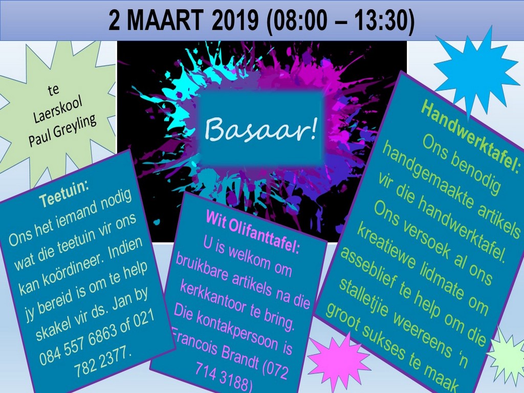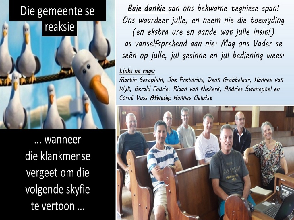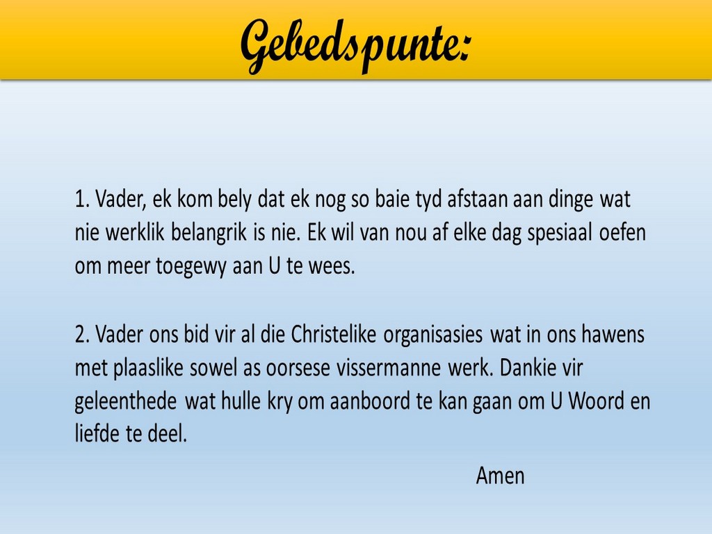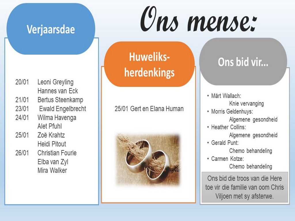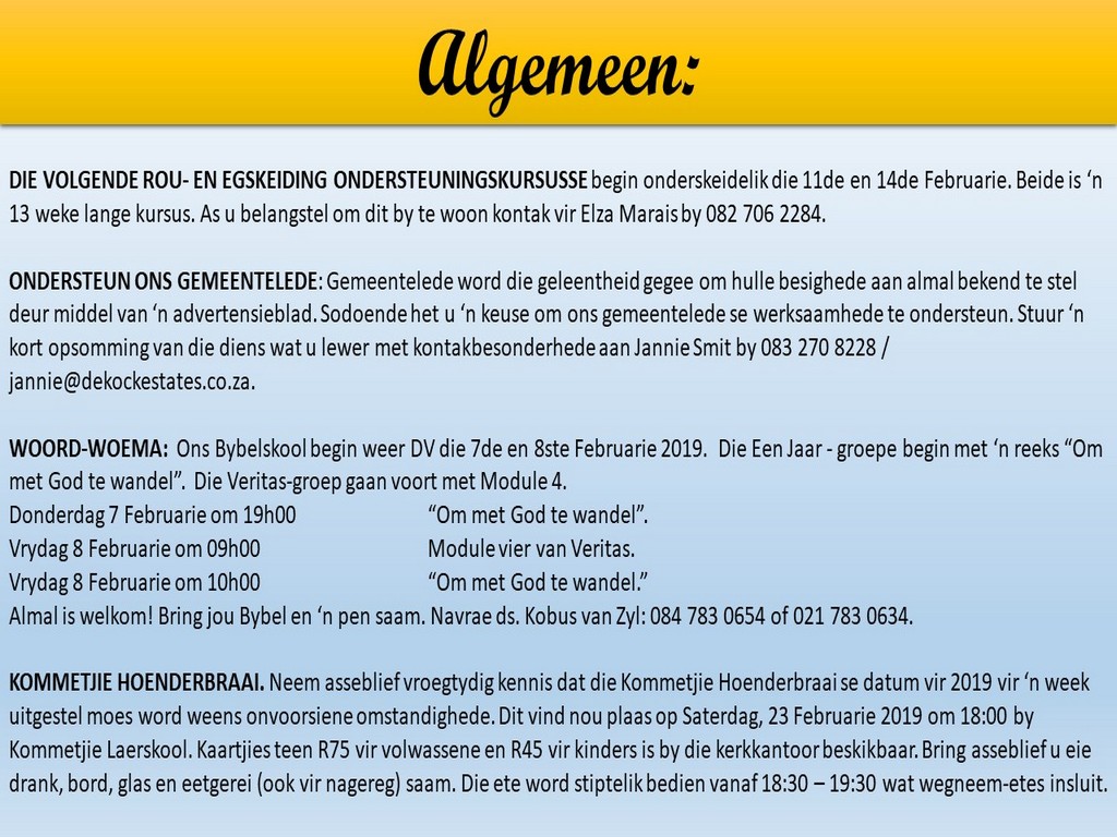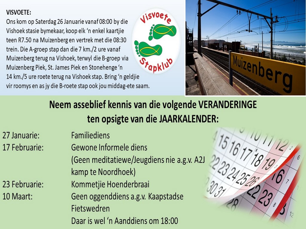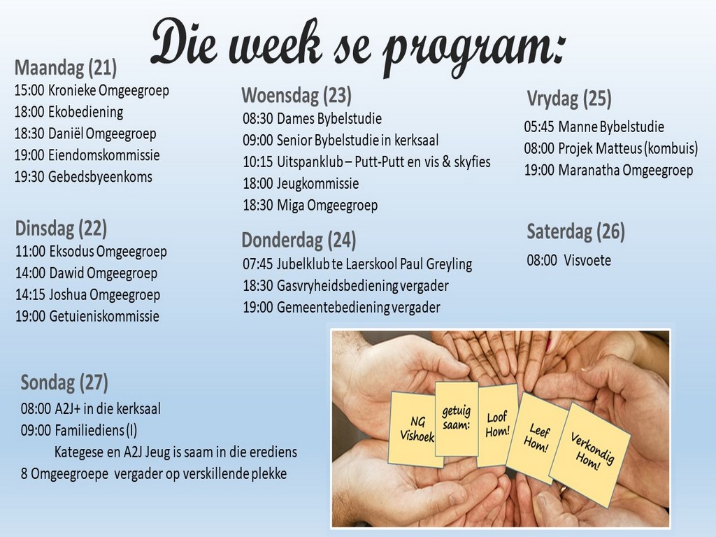 Om ons weeklikse nuusbrief te ontvang: Stuur 'n e-pos namedia@ngvishoek.co.za