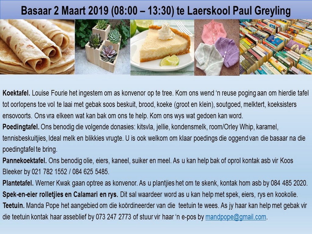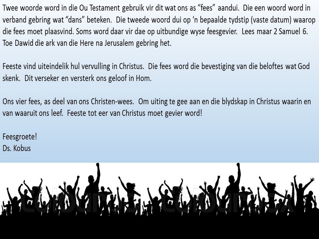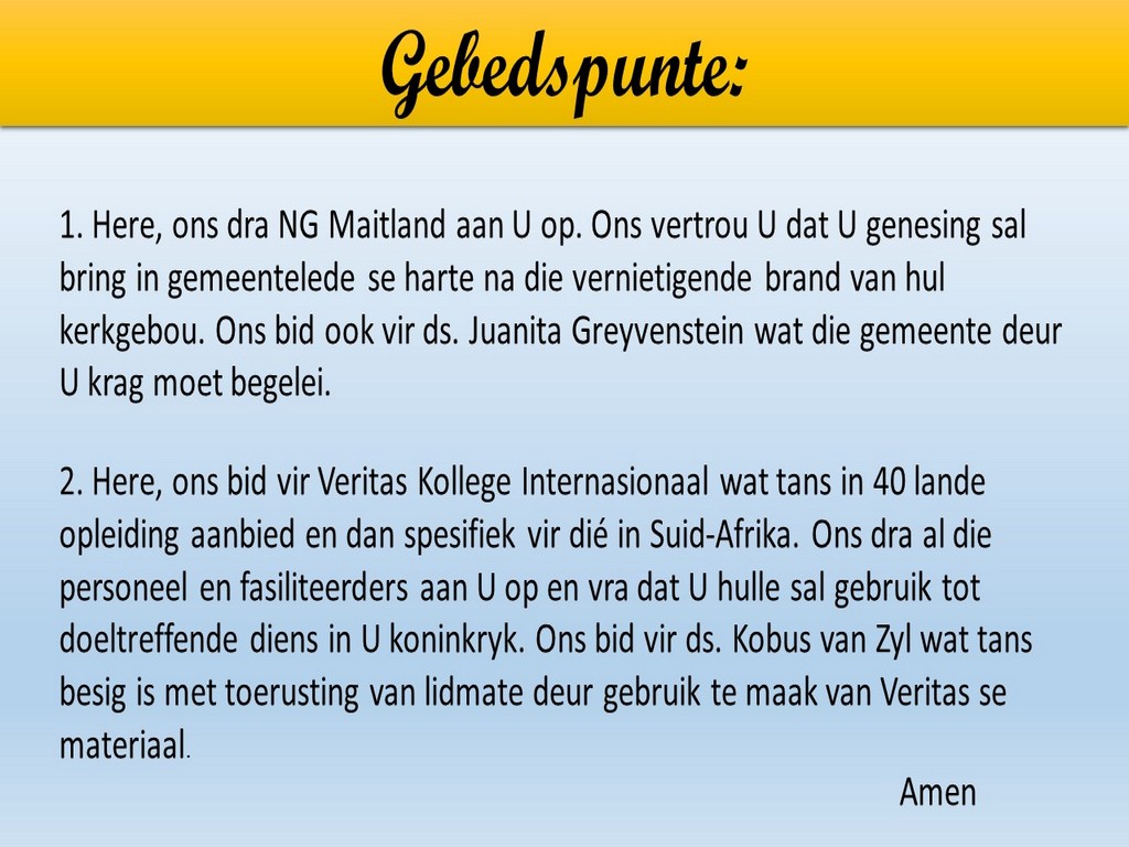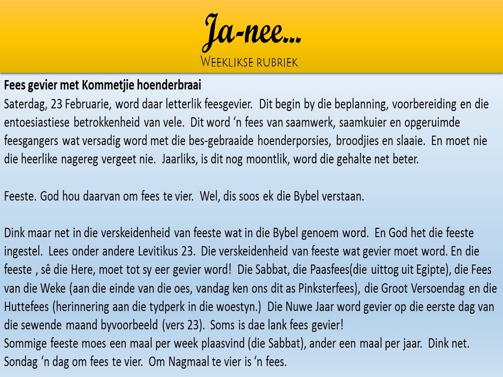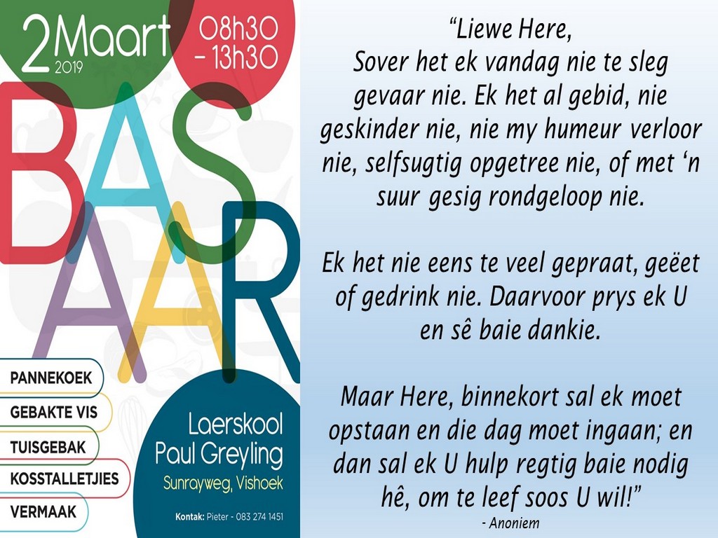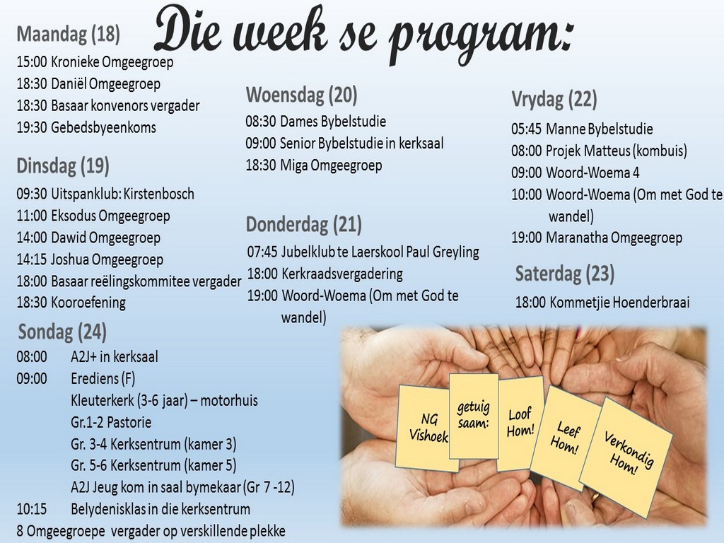 Om ons weeklikse nuusbrief te ontvang: Stuur 'n e-pos namedia@ngvishoek.co.za