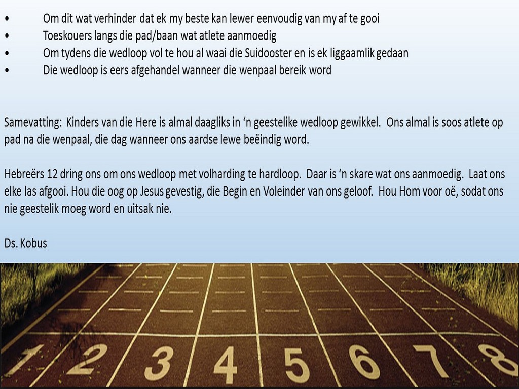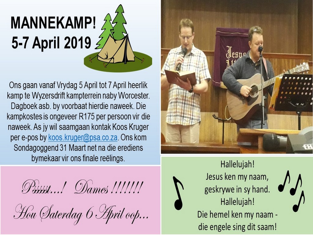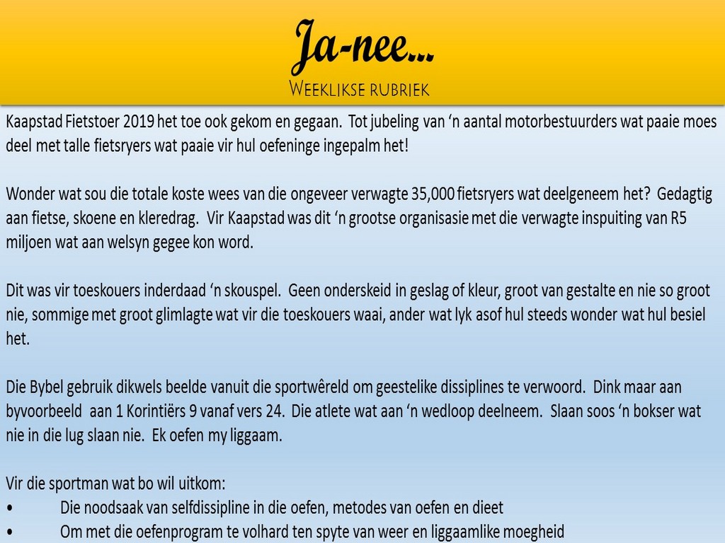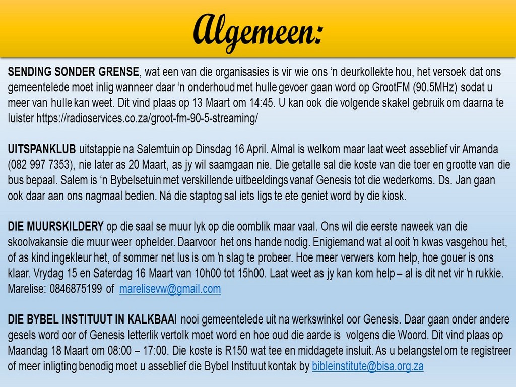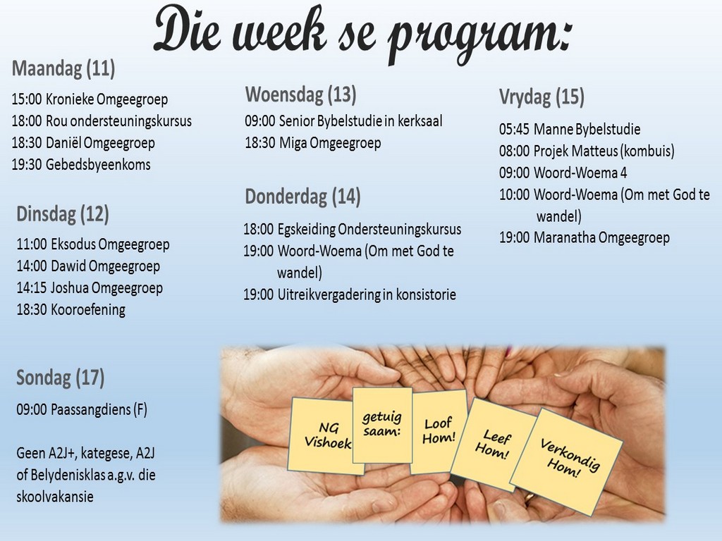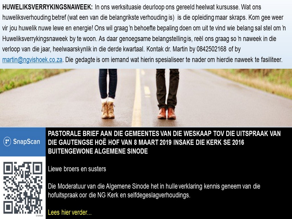 Om ons weeklikse nuusbrief te ontvang: Stuur 'n e-pos namedia@ngvishoek.co.za
