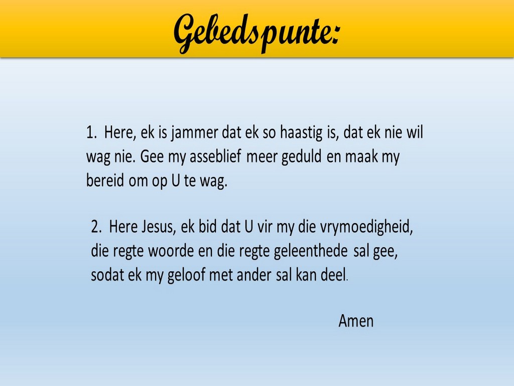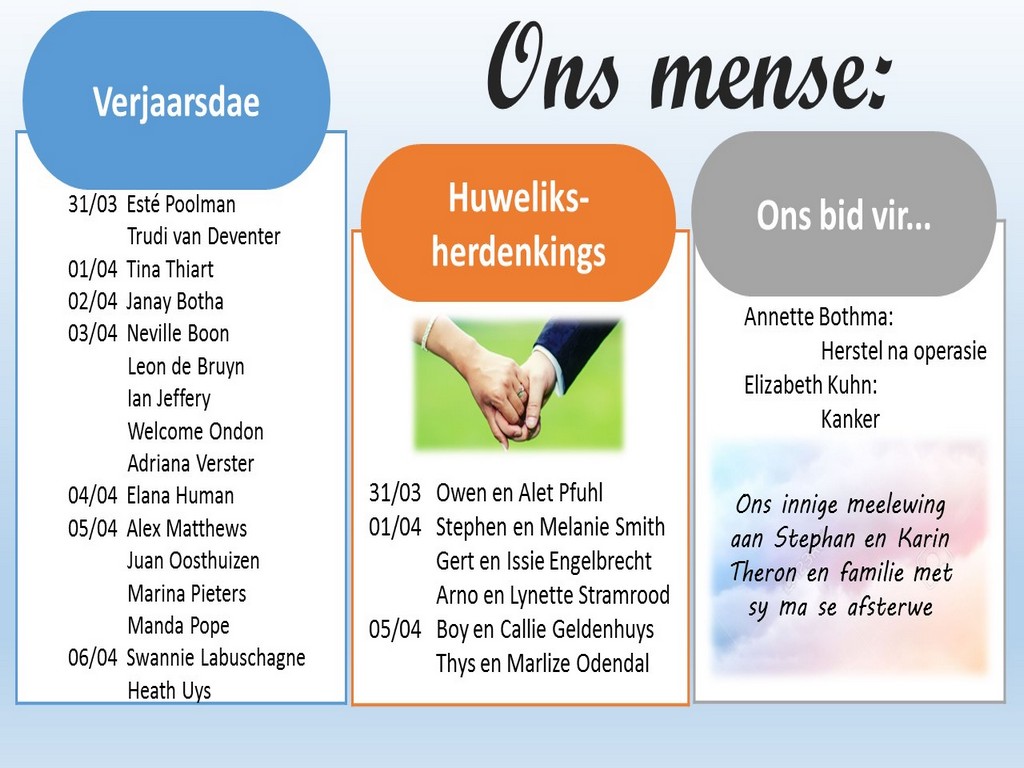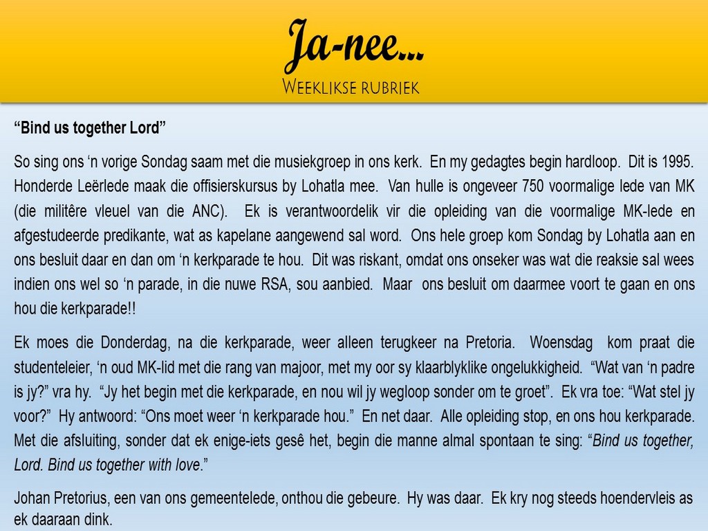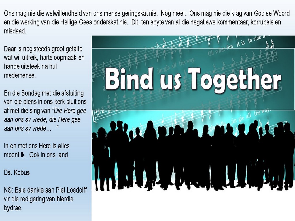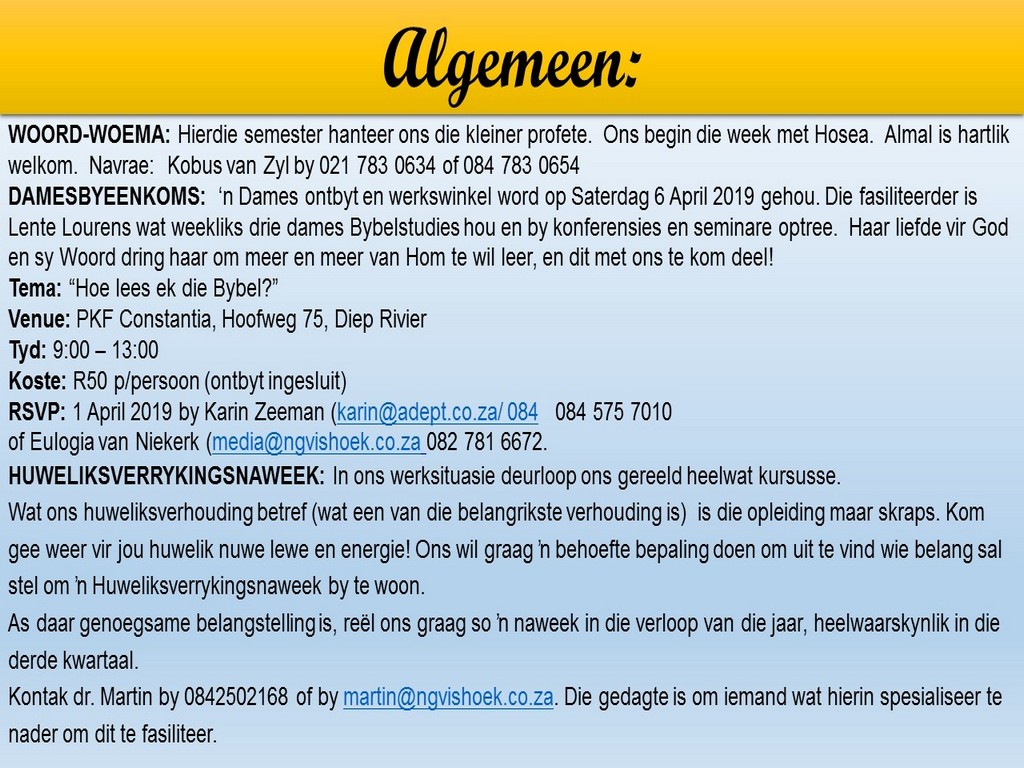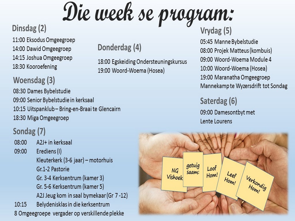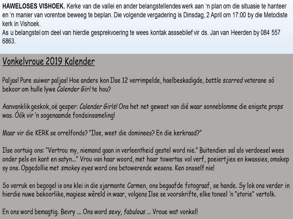 Om ons weeklikse nuusbrief te ontvang: Stuur 'n e-pos namedia@ngvishoek.co.za